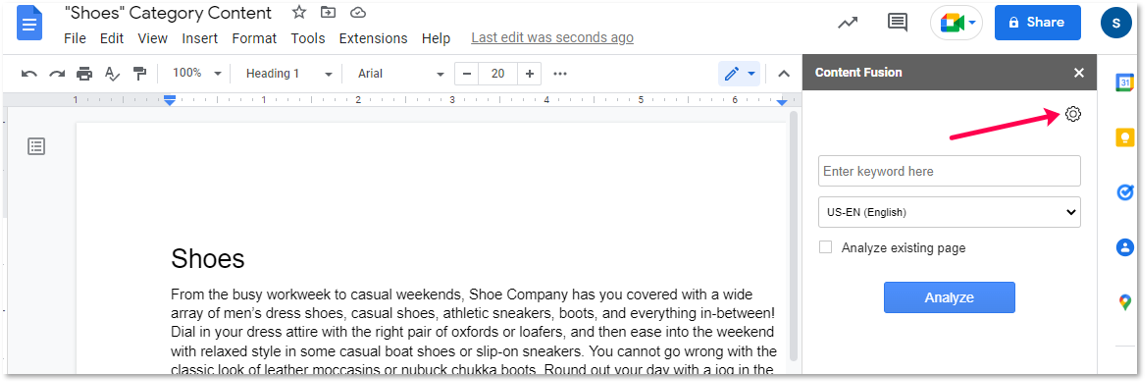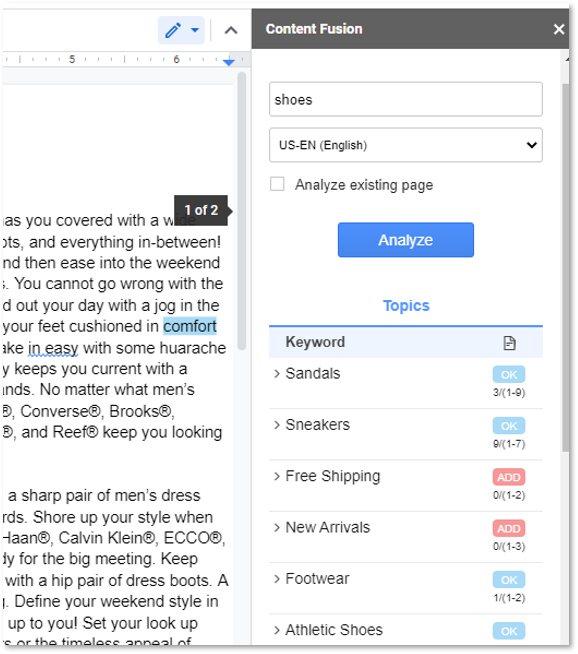 The Content Fusion extension allows writers seamless access to all the Content Fusion analysis and context from inside the Google Docs environment.