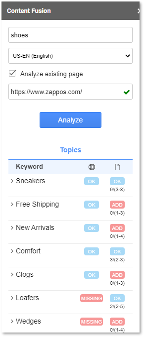 If your website is crawlable by seoClarity, we will retrieve the content and show you gaps in usage of key concepts and terms.