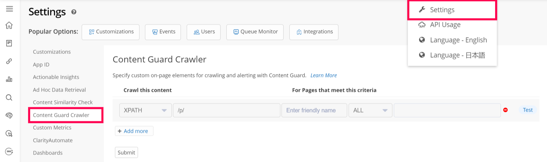 The Content Guard Crawler tab within the Settings page is where any custom content to be tracked for a page can be specified. This includes options for an XPath, CSS, Div ID or Div Class to parse from the specified pages. Once custom content is added, crawling for that element will go into effect with the very next crawl.