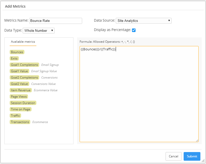 Custom Metric ExamplesTo create Bounce Rate, the formula would be Bounces/Traffic: