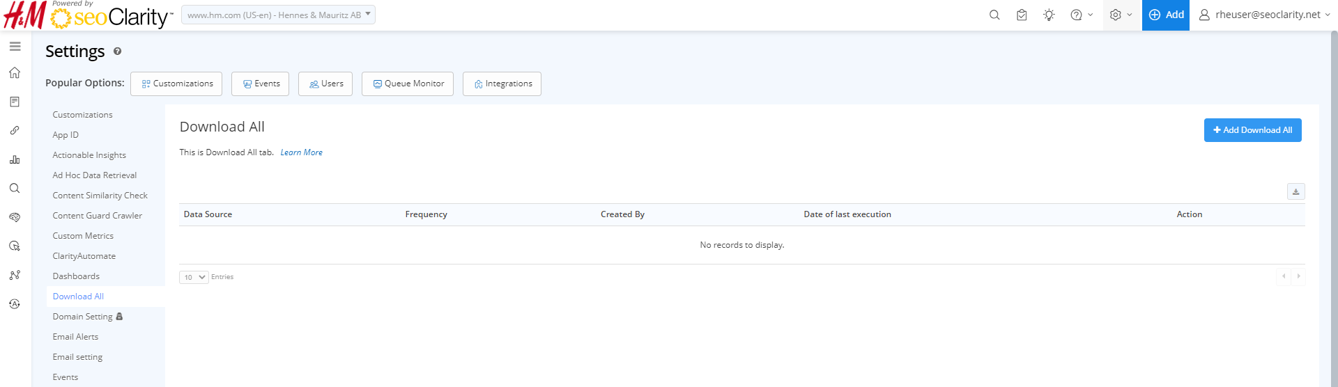 Action: Select the + Add Download All button to request a new download all from Site Analytics or Search Analytics.