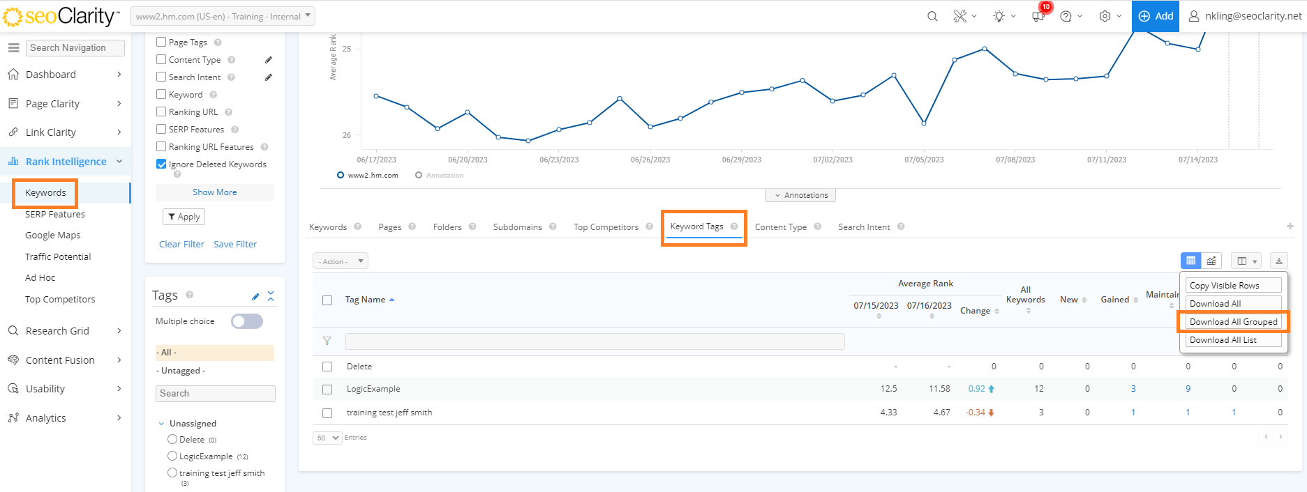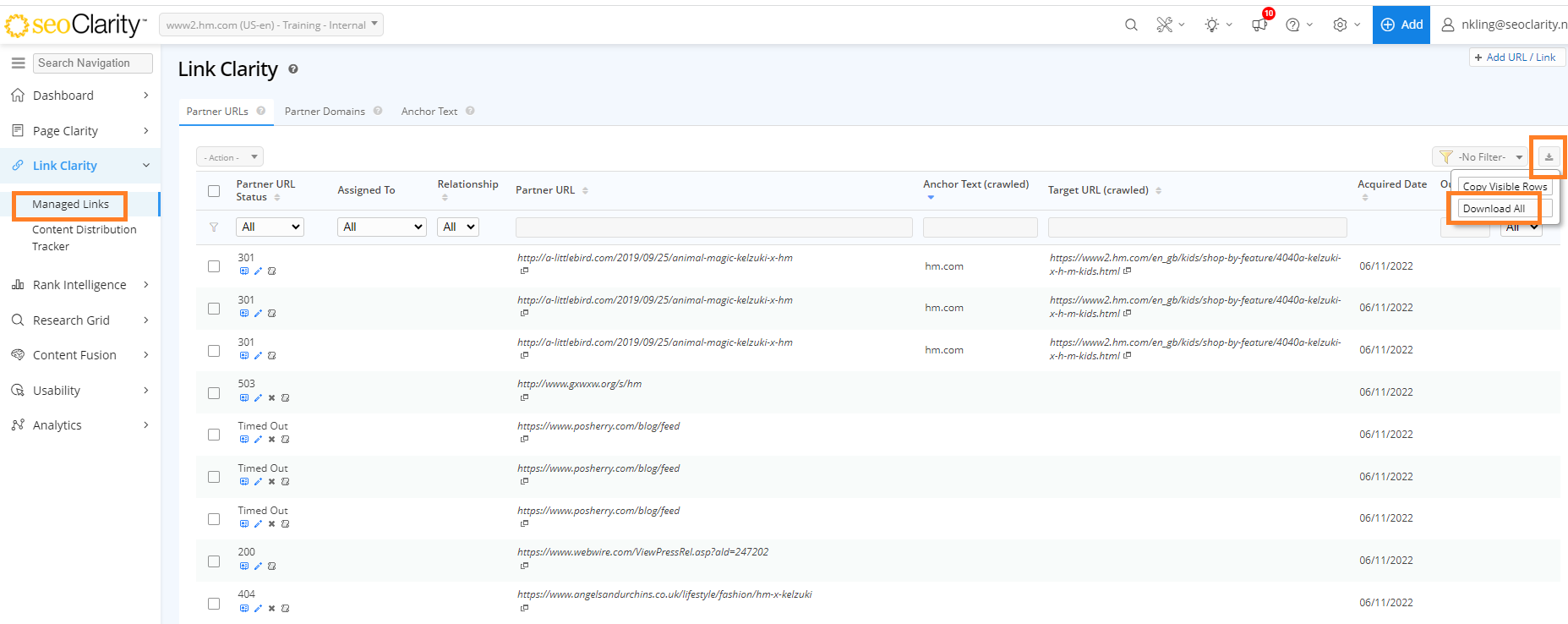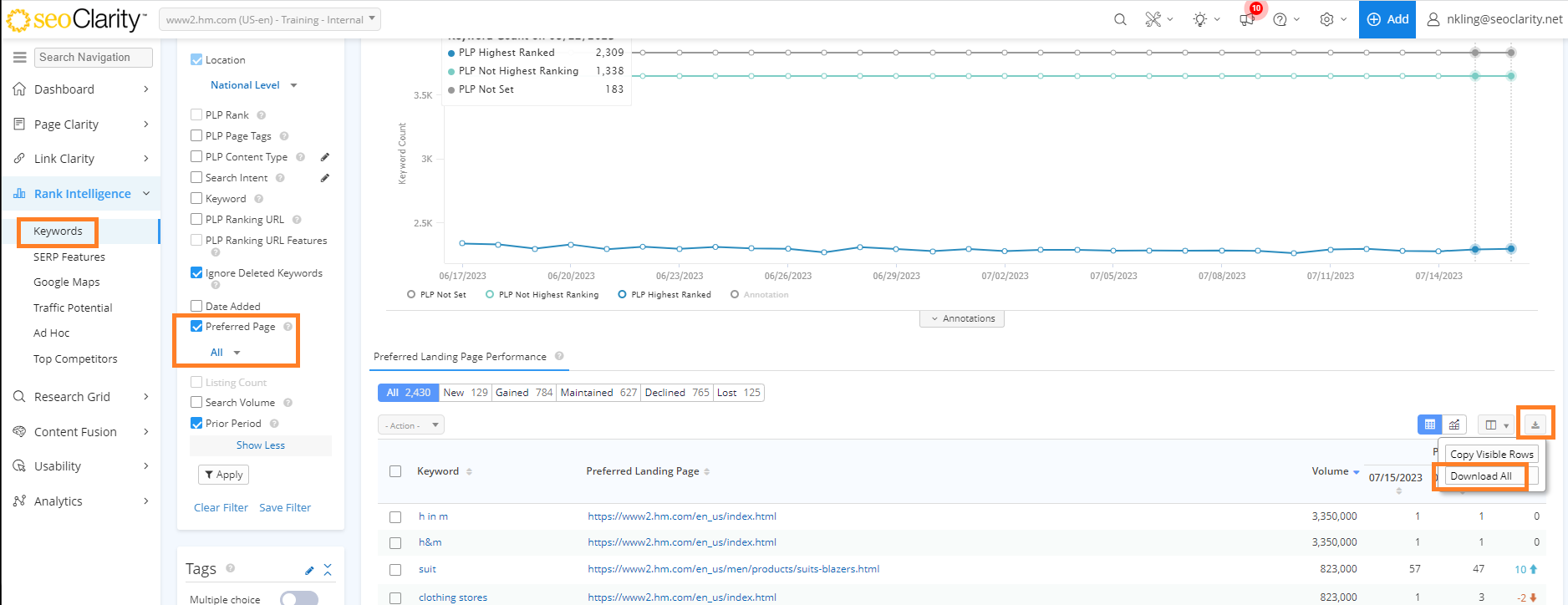 The first set of data that is good to hold onto is your managed page data. Know the health of your managed pages is essentially knowing the health of your website and knowing the performance of the pages on a search engine result pages. Downloading and keeping your page data allows you to continue seeing a trended view of your pages' rankings, search volume, health, etc. in the future.
