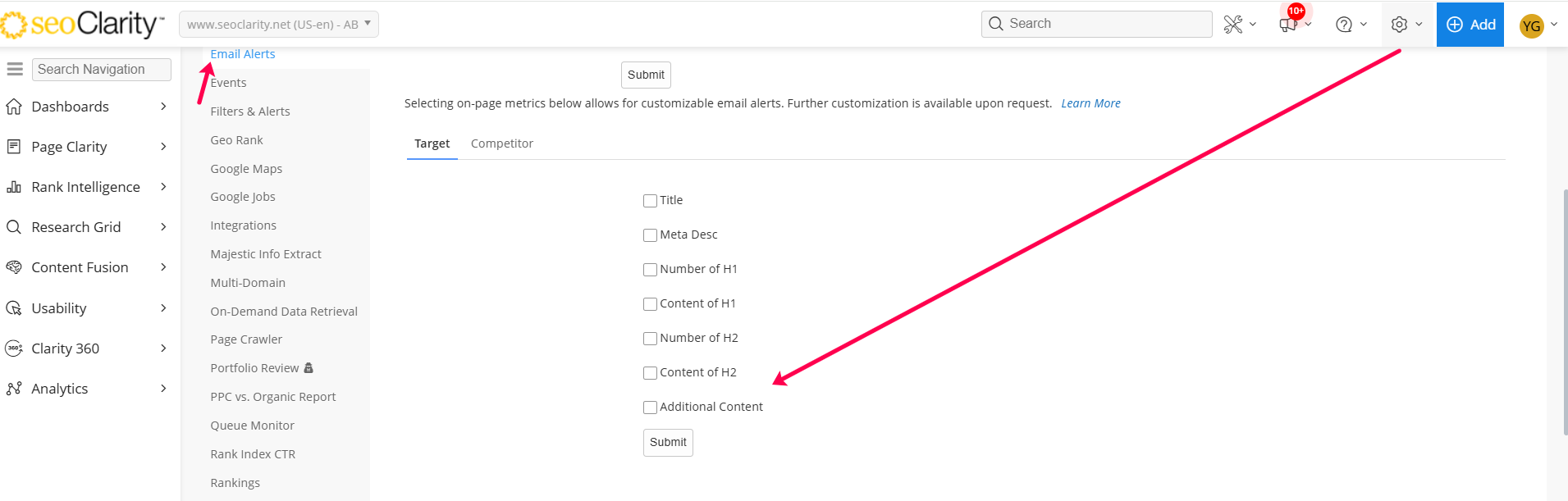 As previously mentioned, alerts can be set up so they are sent only when a change occurs. The content changes are tracked in the Title, Meta Description, Meta Keywords, Number of H1, Content of H1, Number of H2, Content of H2, and DIV Content for your managed pages as well as for your associated competitors. Enabling these options will allow Page Clarity Detail>On-site data to be updated whenever content changes on your pages. Learn More