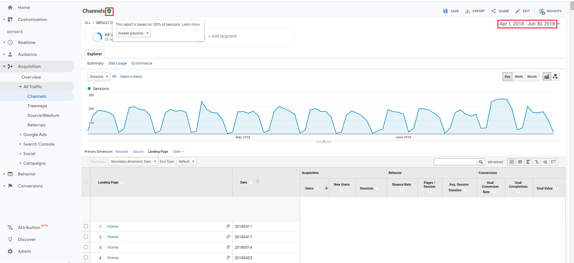 3) Set the date range to the largest available date range to be integrated without incurring sampling, this can vary but 3 months is a good starting point. Ensure the greater precision option is selected and that the report is based on 100% of all sessions.