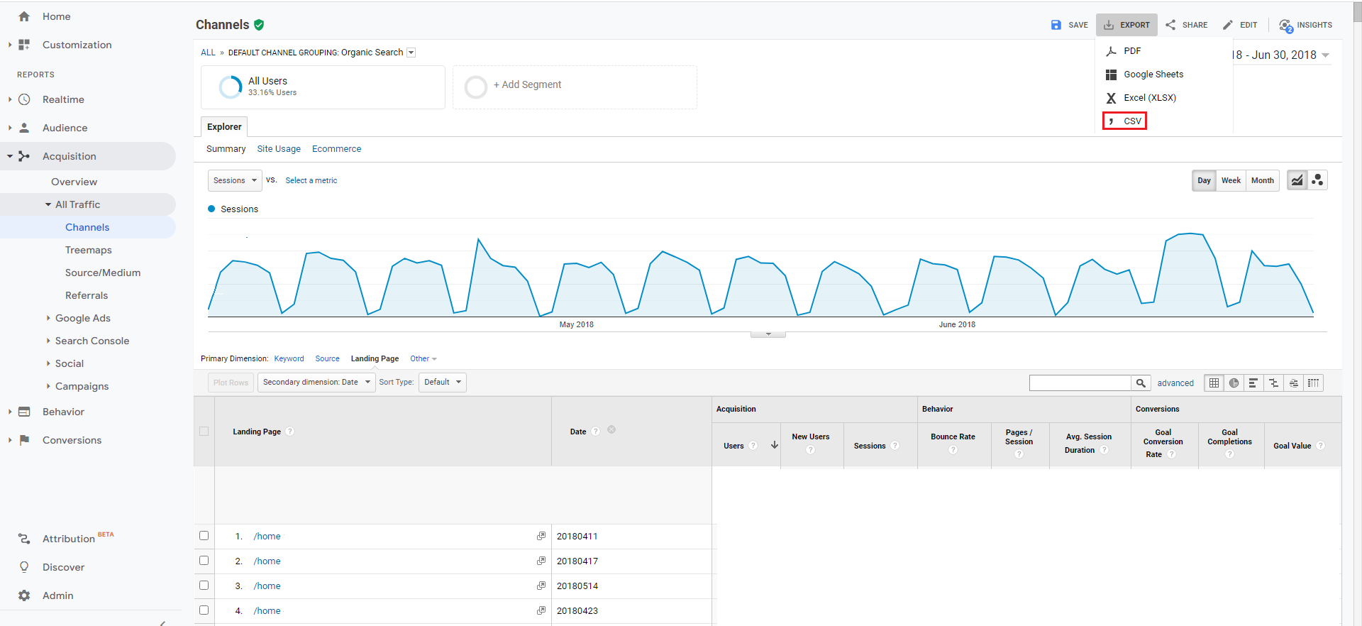 There are multiple ways to export Organic Search data from Google Analytics, this is just one example.