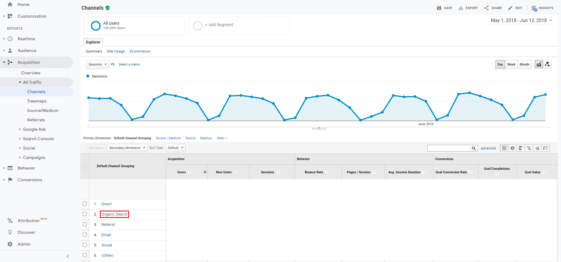 1) Navigate to the Channels Report (Acquisition > All Traffic) and select Organic Search to filter the analytics data accordingly. Keep in mind filters are permanent changes to how the data is processed in GA. Segments filter out a subset of data and do not permanently change the data.
