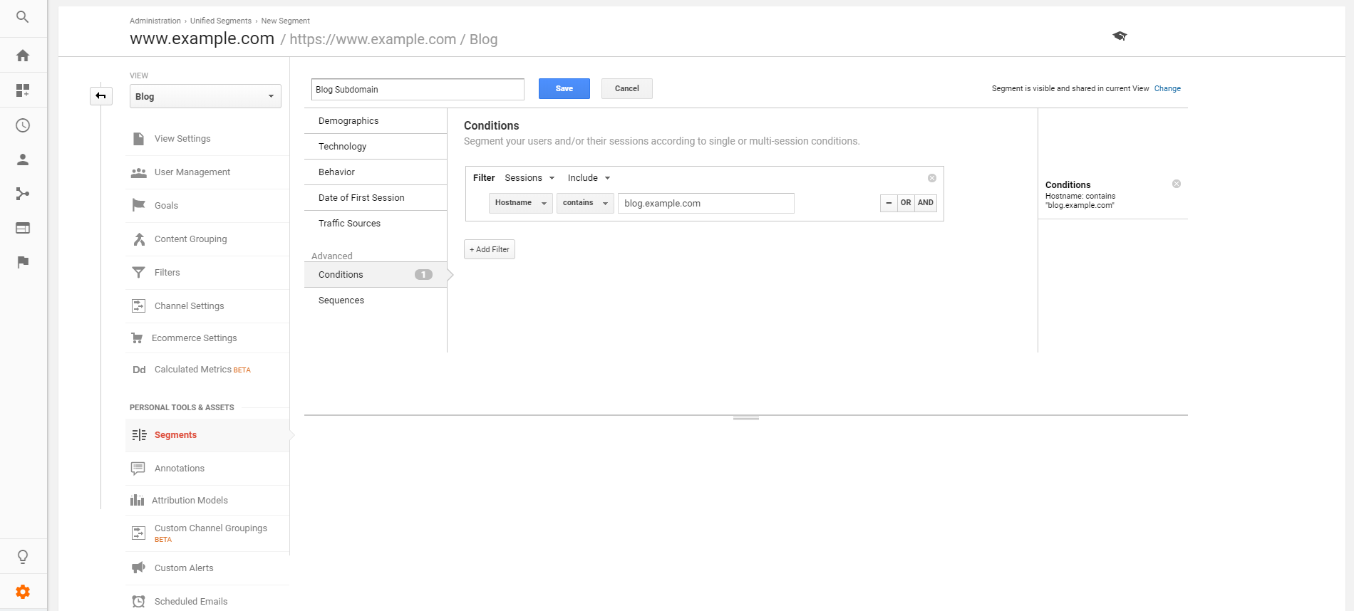 4) Select Hostname (from the Behavior section) contains "example.com".