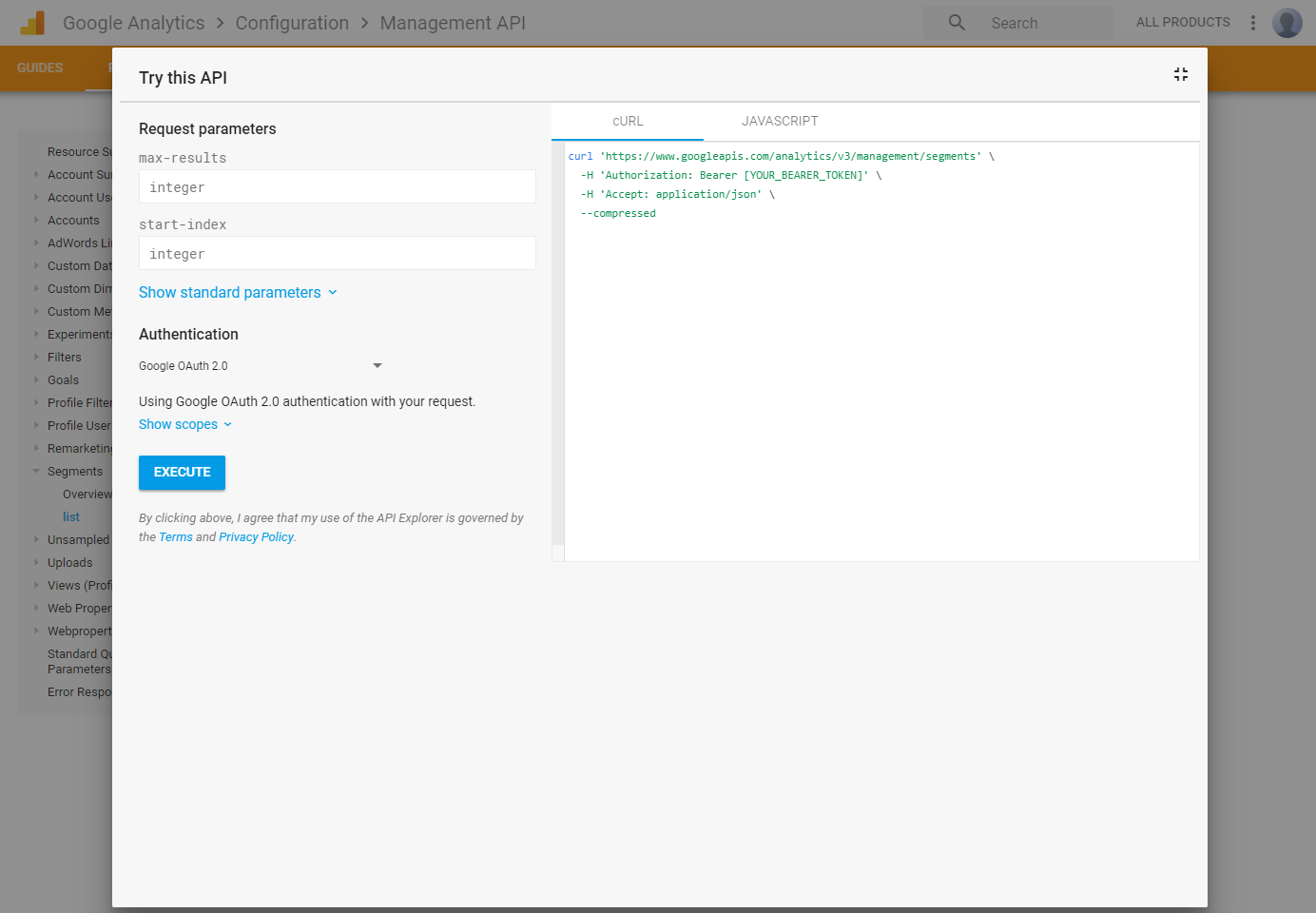 9) Select the Execute button and sign in with the email address that has access to the Google Analytics account you are retrieving the segment IDs for.
