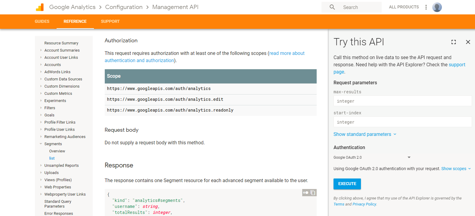 7) Next we need to retrieve the Segment ID by navigating to: https://developers.google.com/analytics/devguides/config/mgmt/v3/mgmtReference/management/segments/list#auth. Alternatively, the segment ID can be found in the URL when it is applied.