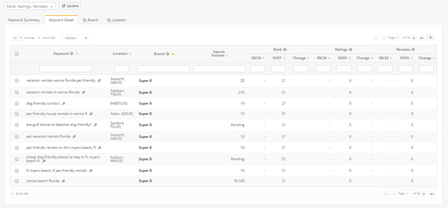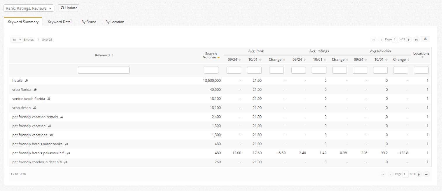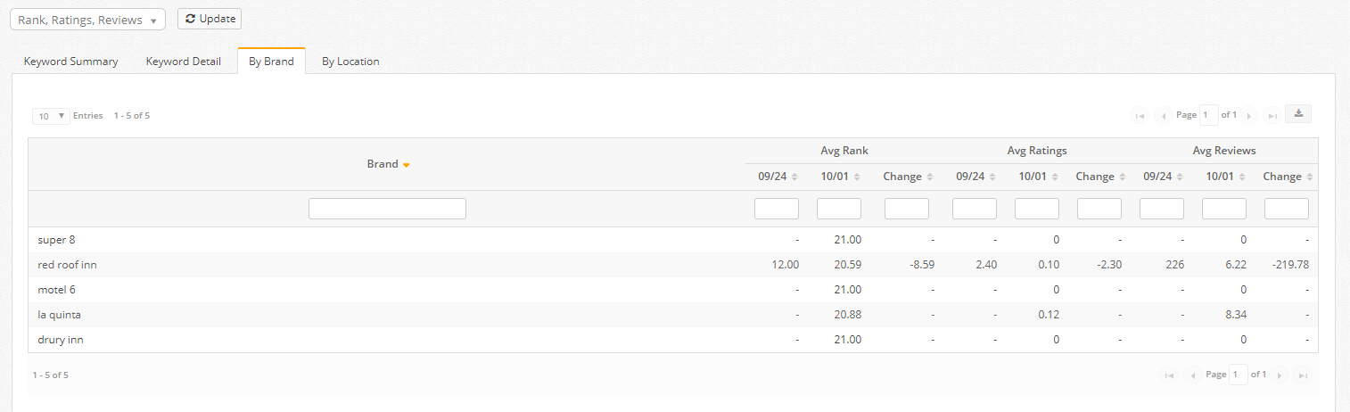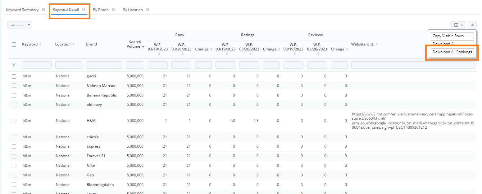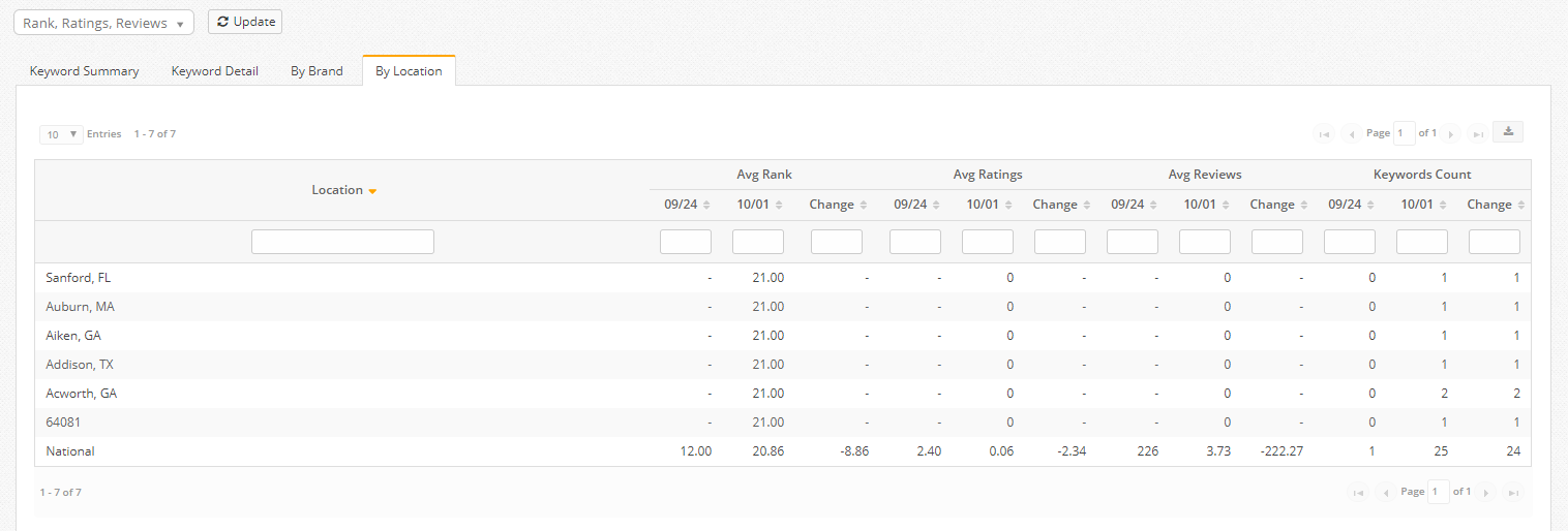 There are 4 data table views including: Keyword Summary, Keyword Detail, Brand, and Location. Average Rank, Ratings and Review metrics can be selected via the dropdown above the table.