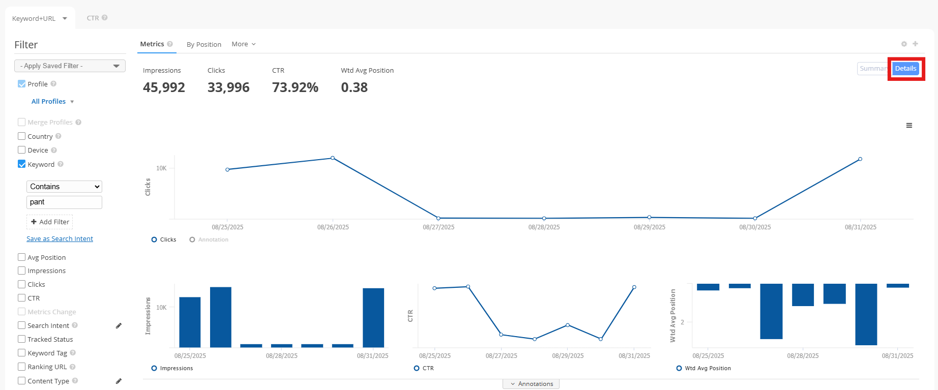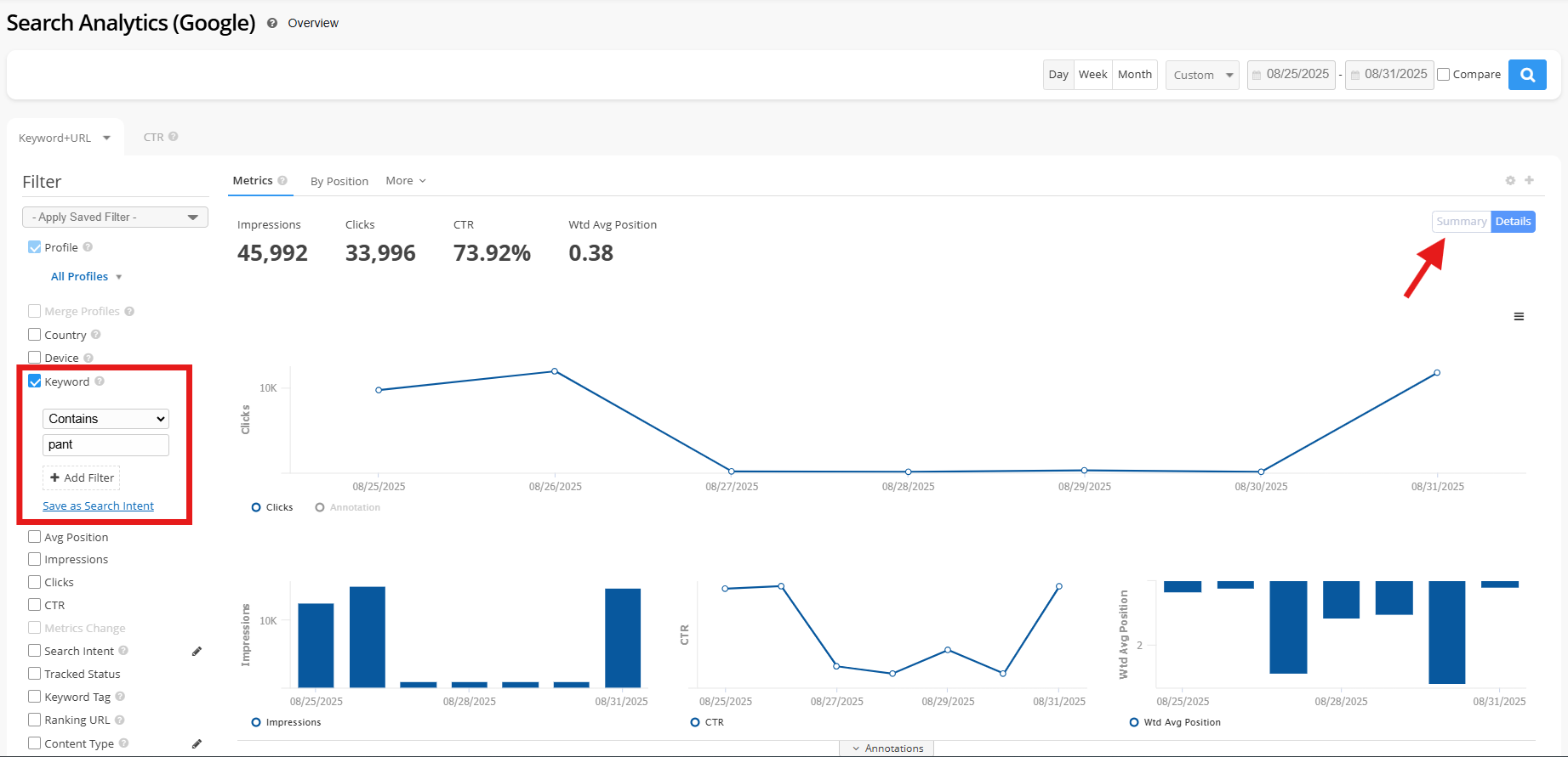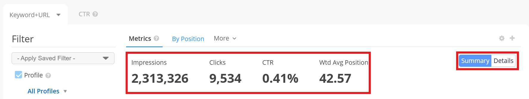 - The Summary view option is not available once filters are applied. When a filter is applied in Google Search Console it uses the same raw data they provide us and we display in the Detail view.