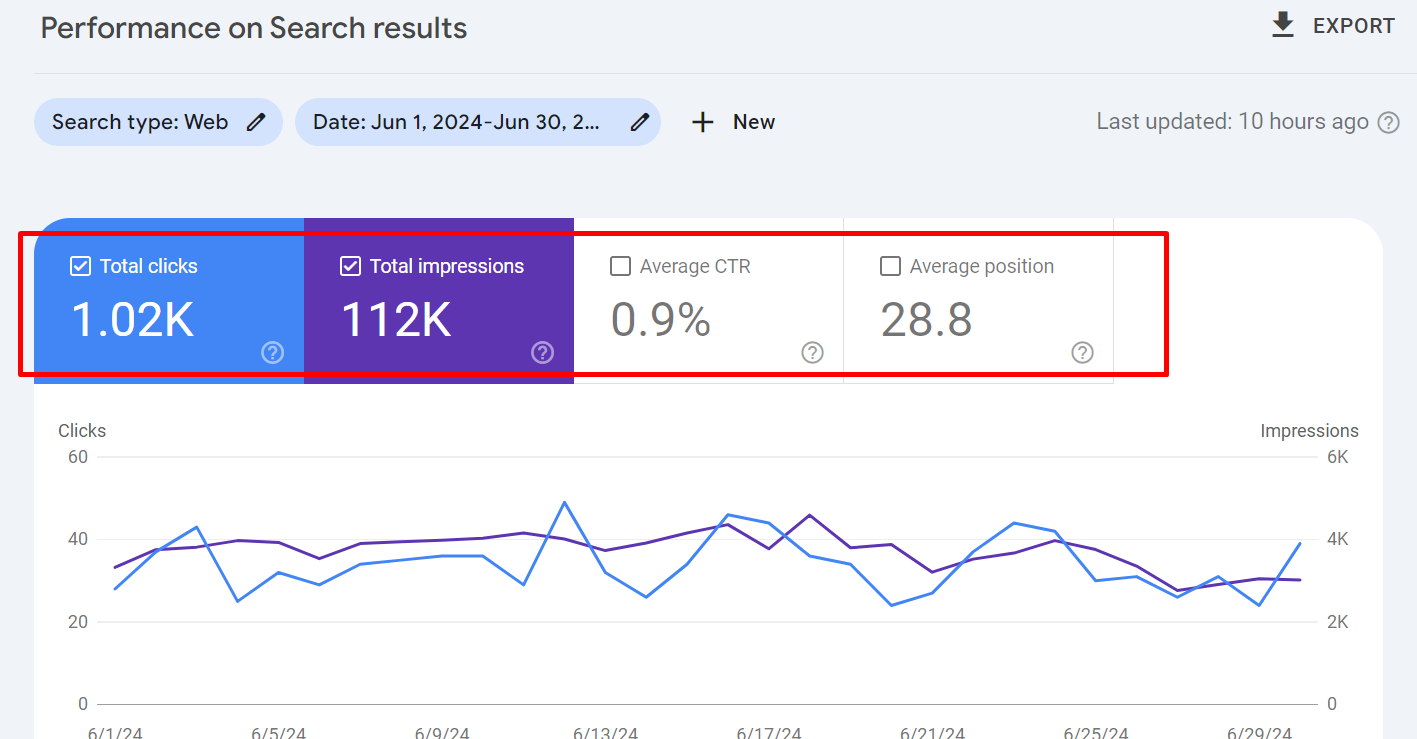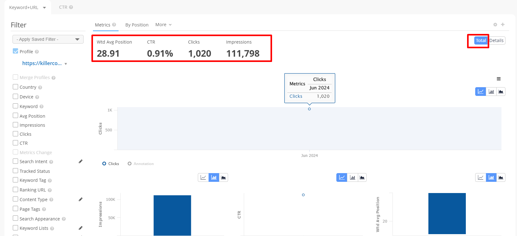 - Summary View: Equal to the Summary Box data seen in Google Search Console. The Summary view is not available when filters are applied.
