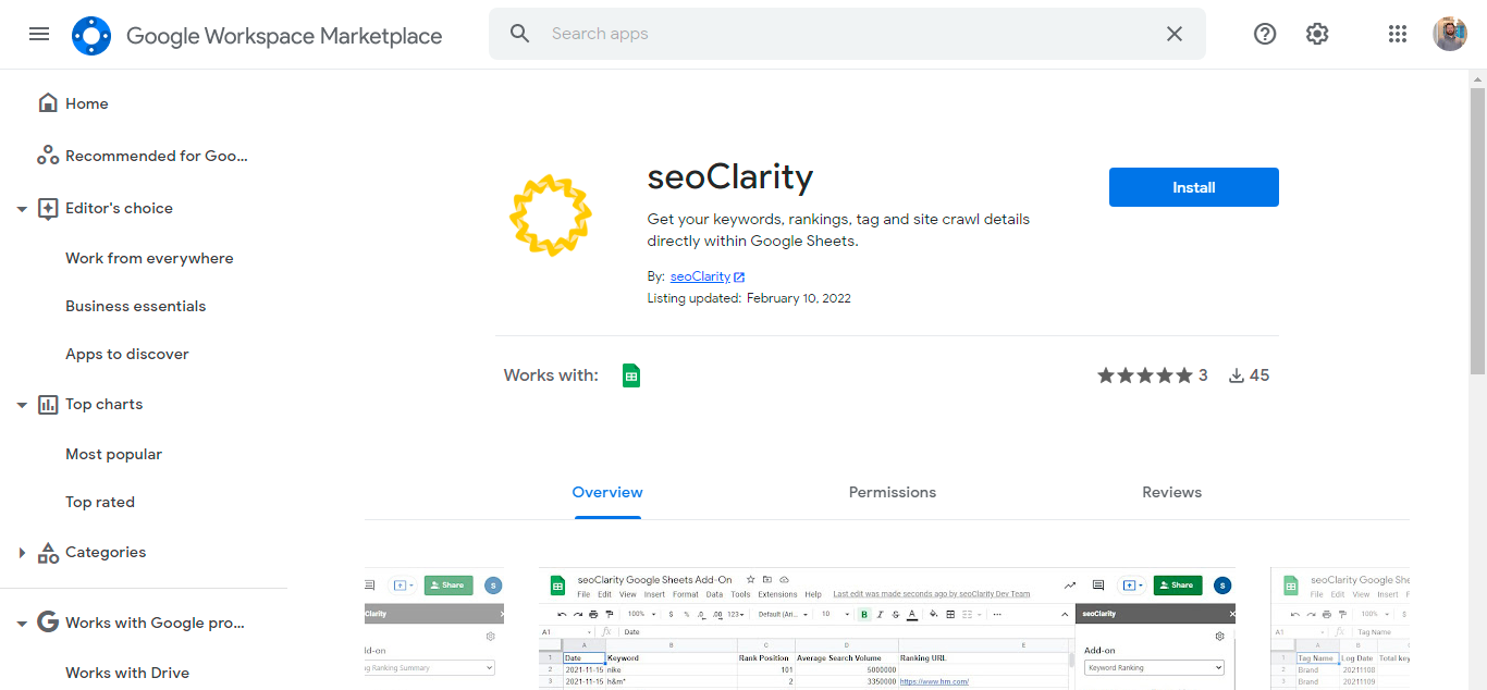 1) Navigate to the seoClarity Google Sheets add-on page and select Install.