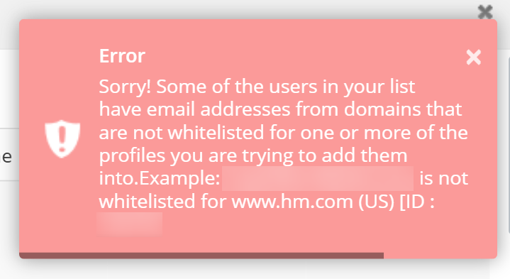 Q: When adding a user, I got the error "Sorry! Some of the users in your list have email addresses from domains that are not whitelisted for one or more of the profiles you are trying to add them into."