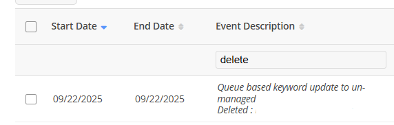 In the "Event Description", type "delete" to find the list of deleted keywords.