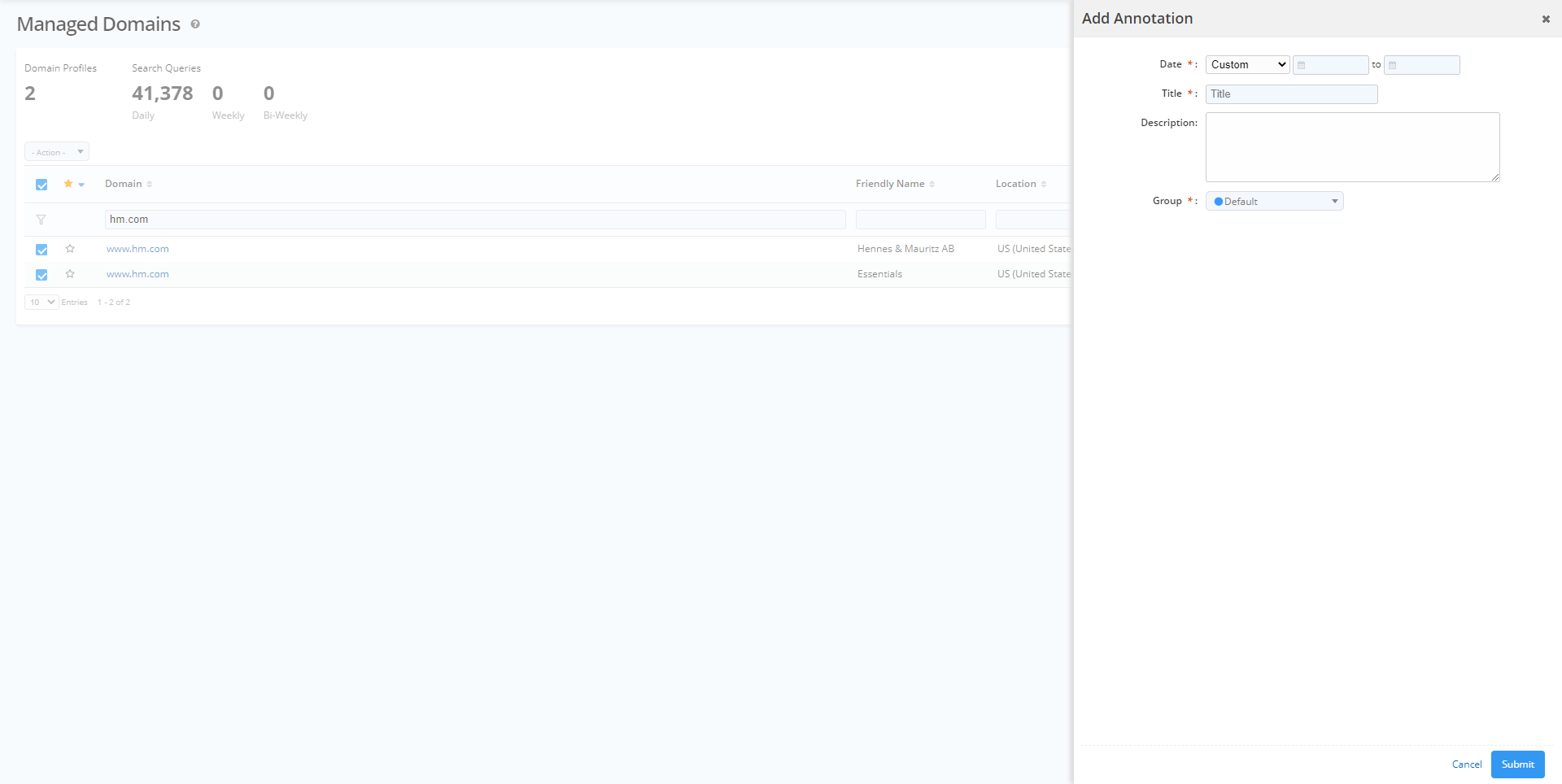 Once domains have their checkbox marked and the Add Annotation option has been selected, the Annotation sidepanel is displayed and allows for the Annotation date, title, description and group to be input.