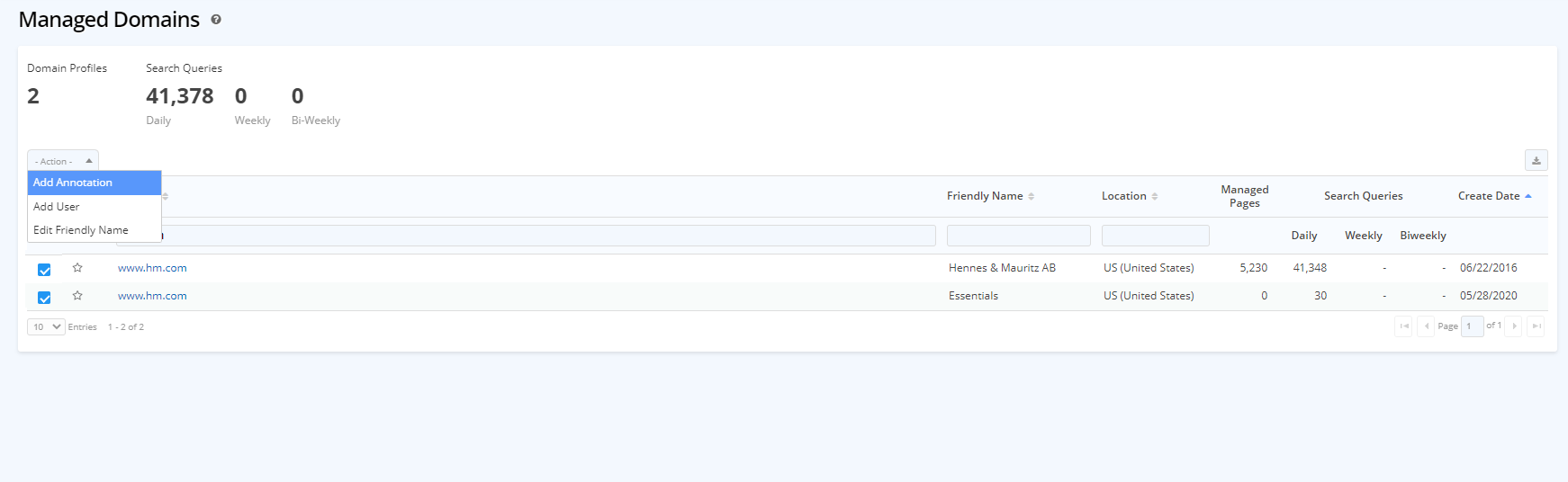 Managed Domains page by selecting the checkbox for the domains the annotation should be added to and using the Add Annotation option available on the Actions dropdown.