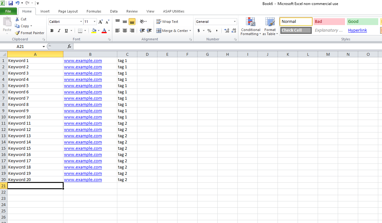 The example below will create an association (set the preferred landing page) with 'keyword1' to 'page1'. It will also create a keyword tag for 'keyword1' with 'tag1' and a page tag for 'www.example.com' with 'tag1' and 'tag2'. The easiest way to add Keyword + URL + Tags in the platform would be to copy them out of Microsoft Excel and into Keyword + URL + Tag section of the platform.