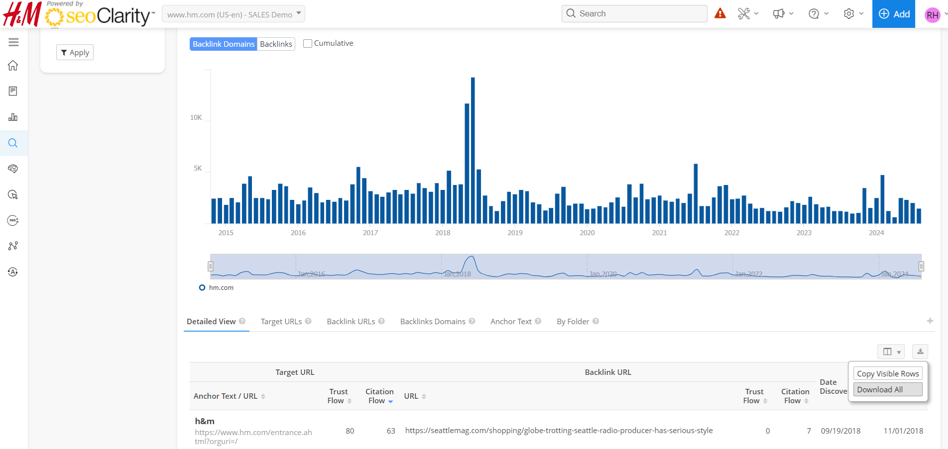 For a download of all backlinks that have been retrieved by the platform so far, select the All Time date range and select Download All when viewing the Detailed view tab of the Research Grid Backlinks feature.