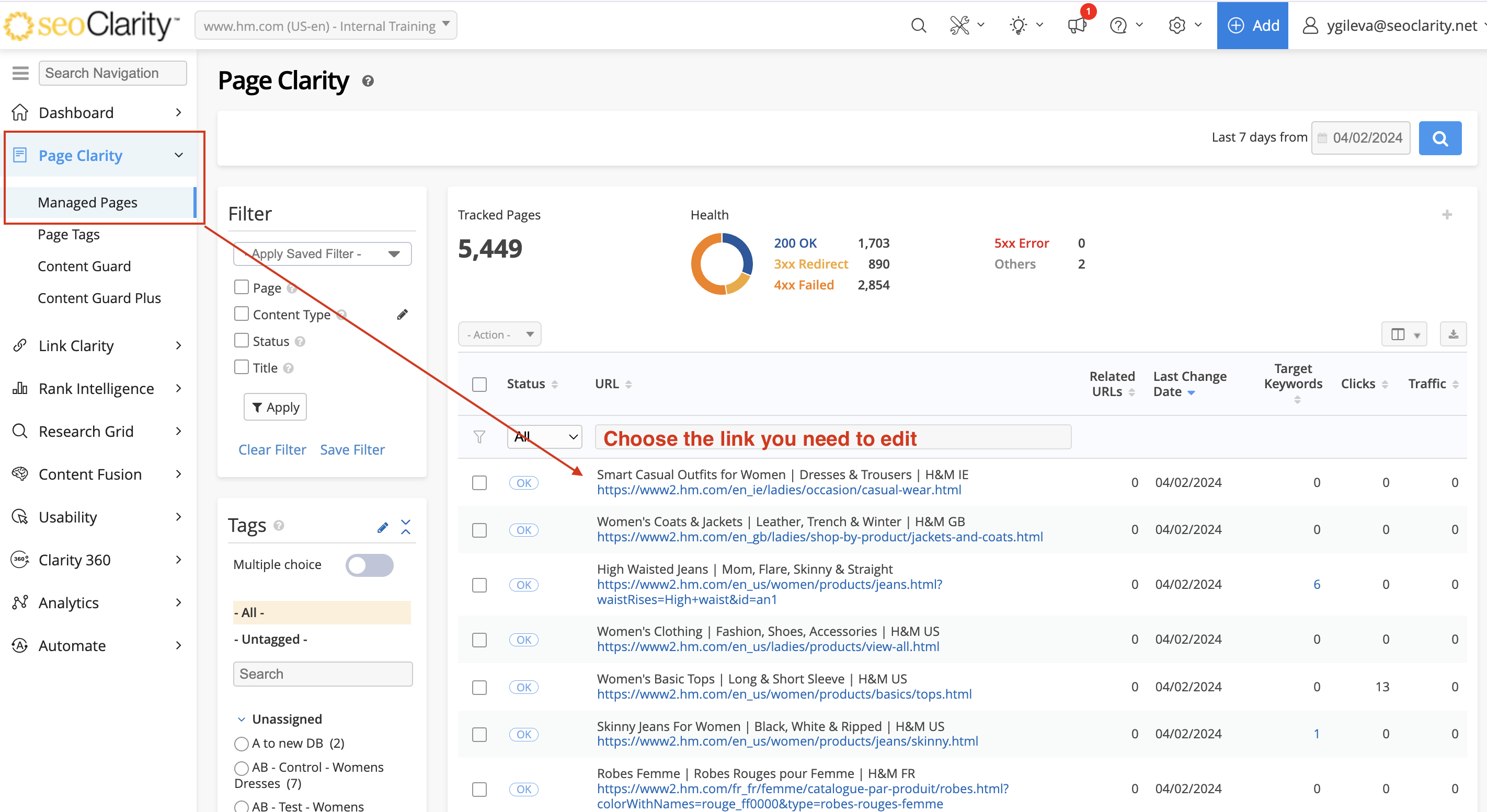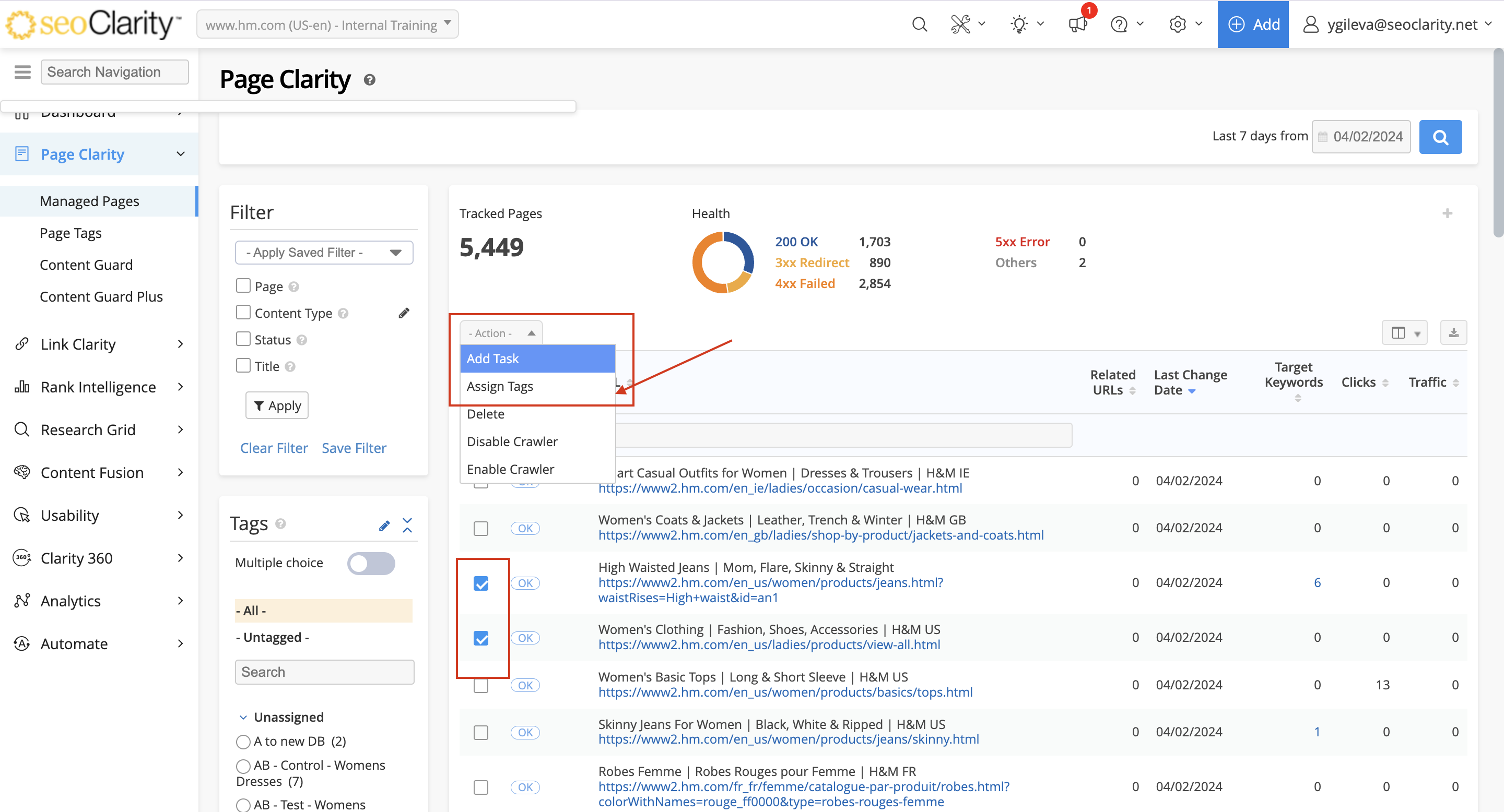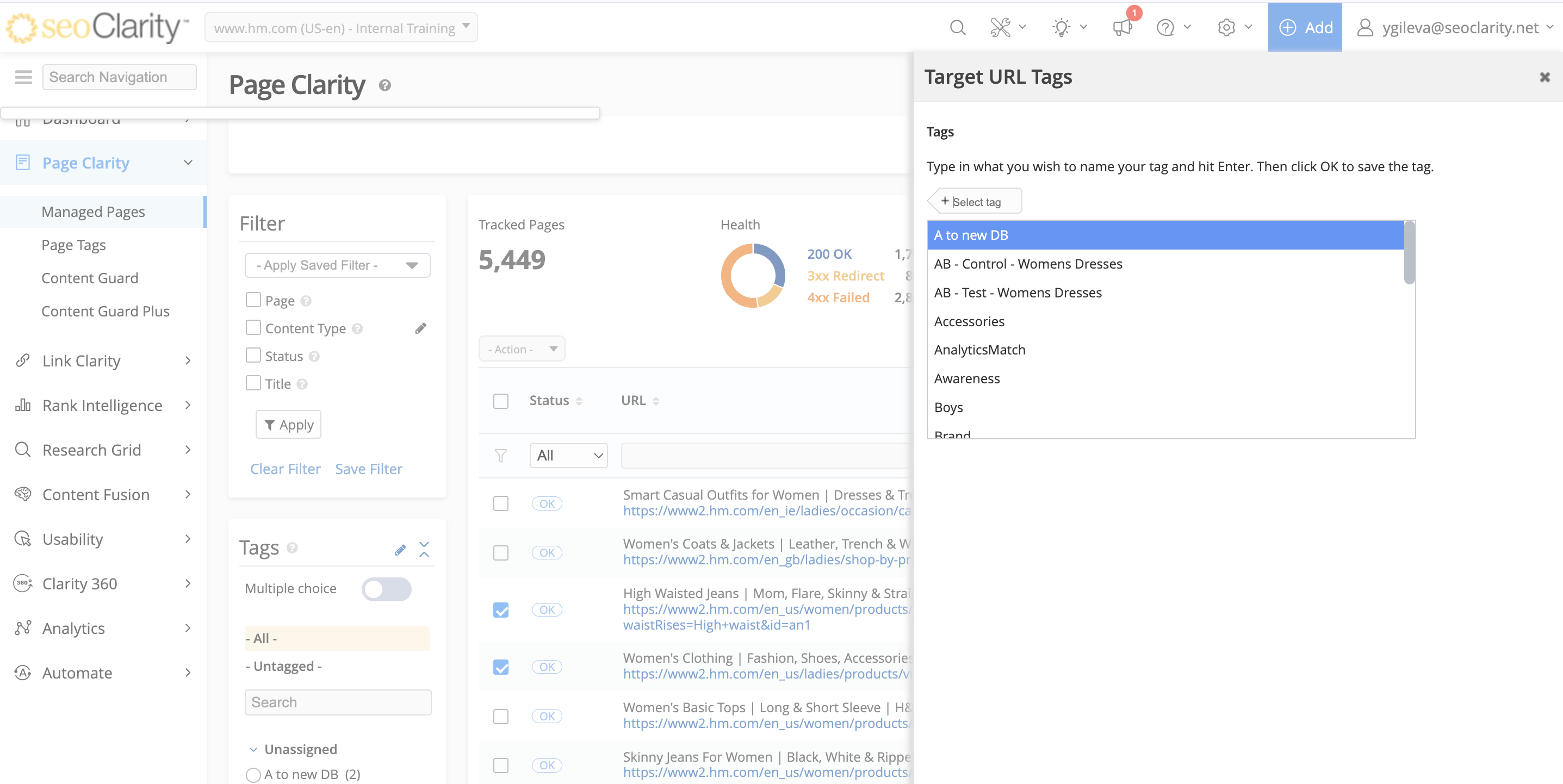 1. Navigate to the Page Clarity page and select the URL(s) that you would like to group into a tag