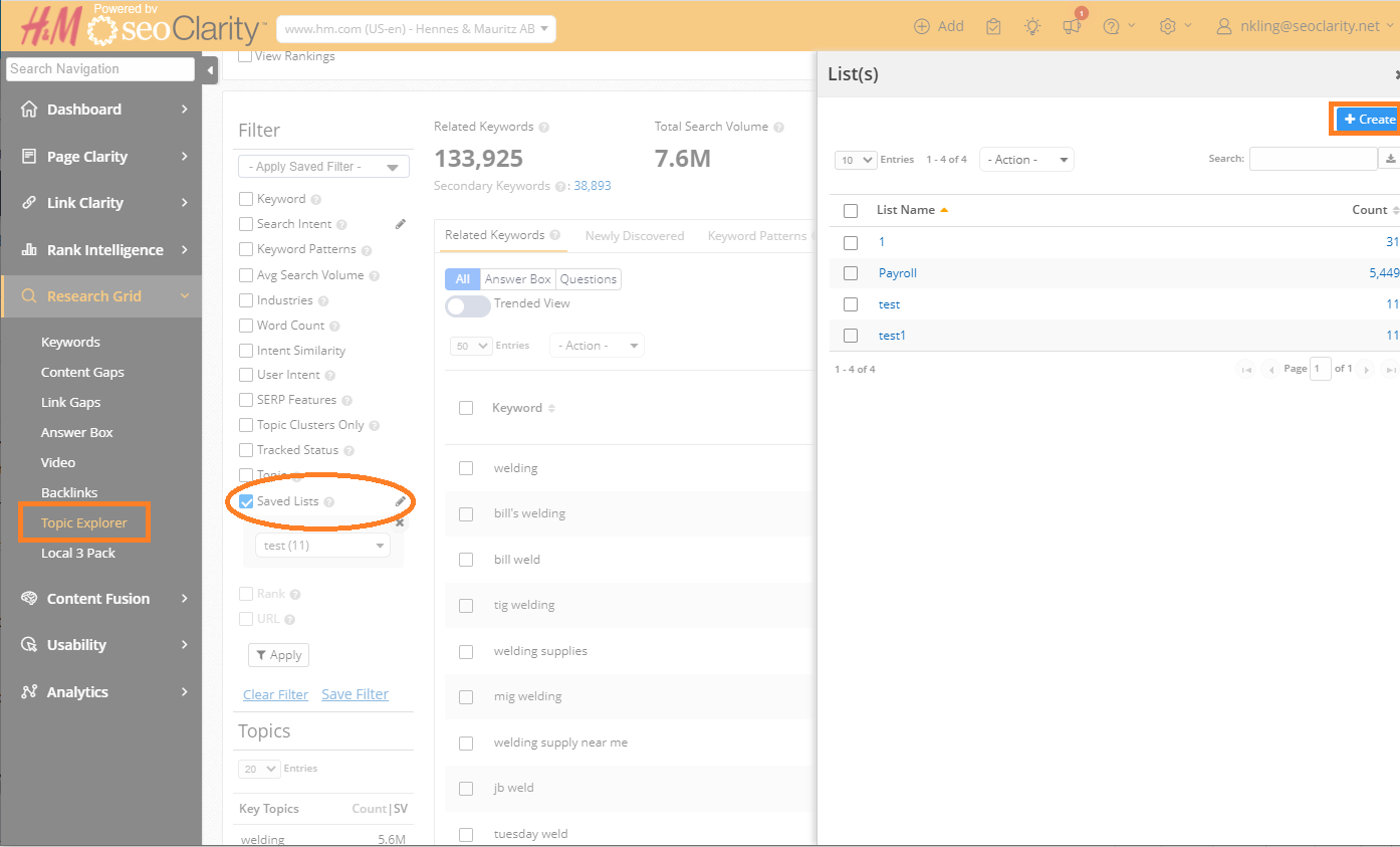 For unmanaged keywords found in Research Grid, these can also be used to find Trended Search Volume. To do so download the keywords and in Topic Explorer use the left side filter menu to create a new saved list by clicking on the pencil icon. The list of keywords can be uploaded in the right side pop-up window.
