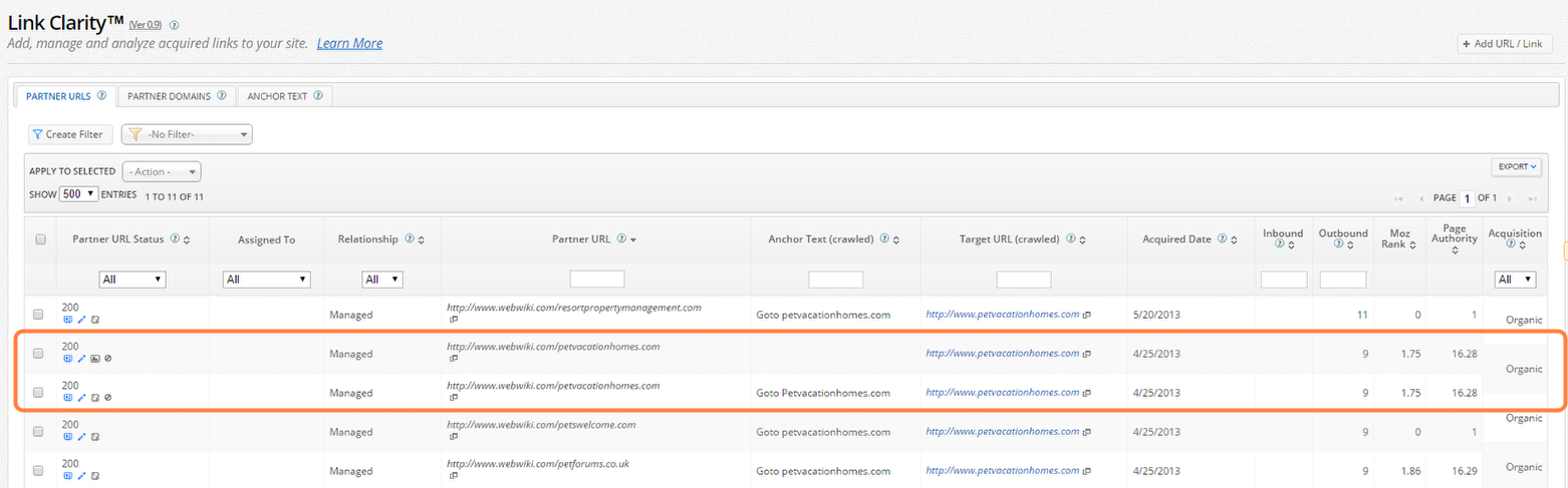 Link Clarity Overview Link Clarity Managed Links is where all of your Partner URLs (backlinks) are housed and tracked. Partner URLs are backlinks that have been manually added to the seoClarity platform by you or your team. Having these Partner URLs ...
