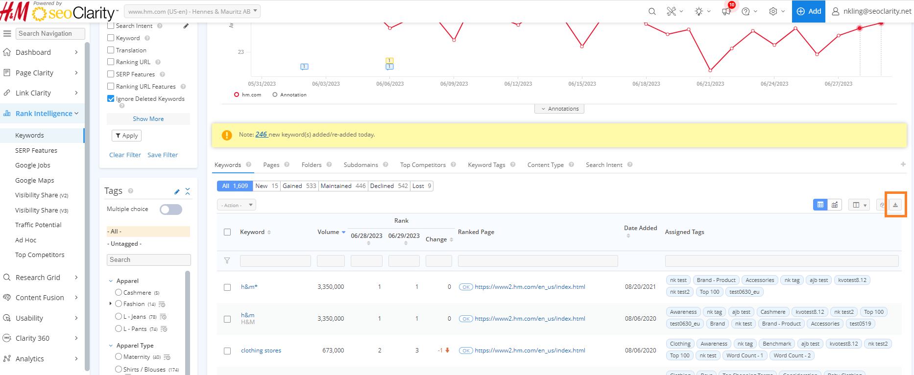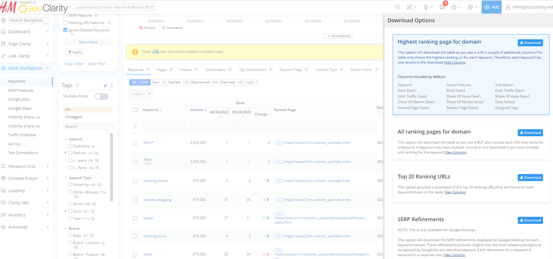 seoClarity Platform data can be exported from charts or tables via the download and export options. Most downloads are instantaneously generated from the time they are selected. Some features, like Rank Intelligence, include additional download options.
