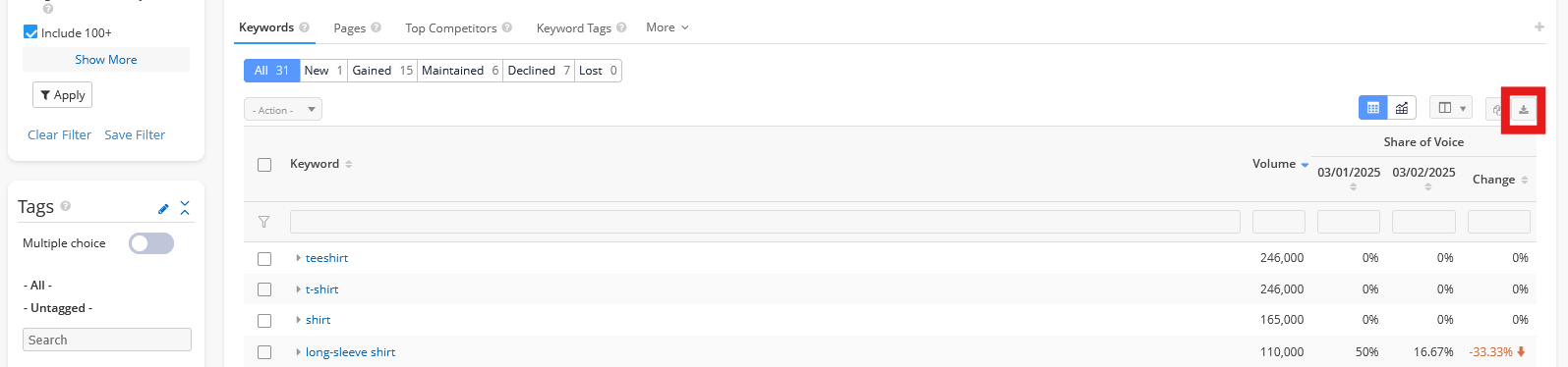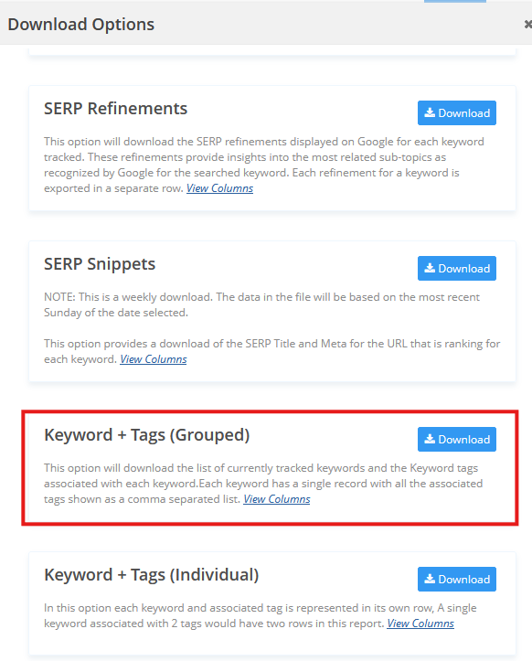 a) If the keyword list has more than 500 keywords, download using "Keyword + Tags (Grouped)".
