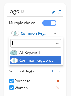 Tags filter, select "Multiple Choice" and then "Common Keywords". This will show the keywords that exist in both Tag A and Tag C (i.e., the ones you moved to Tag B).