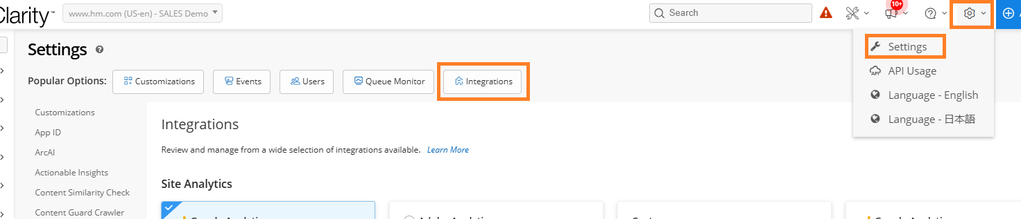 - To access Integration Settings go to the gear icon in the top right corner and then click on Settings.