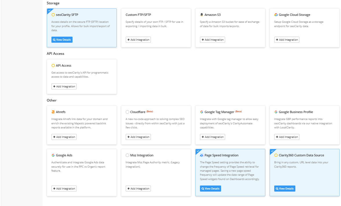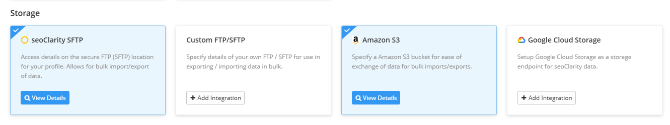 Google Cloud Storage: You can setup Google Cloud Storage as a storage endpoint for seoClarity data. Once the integration is setup, data will not automatically appear but can be requested to be sent there.