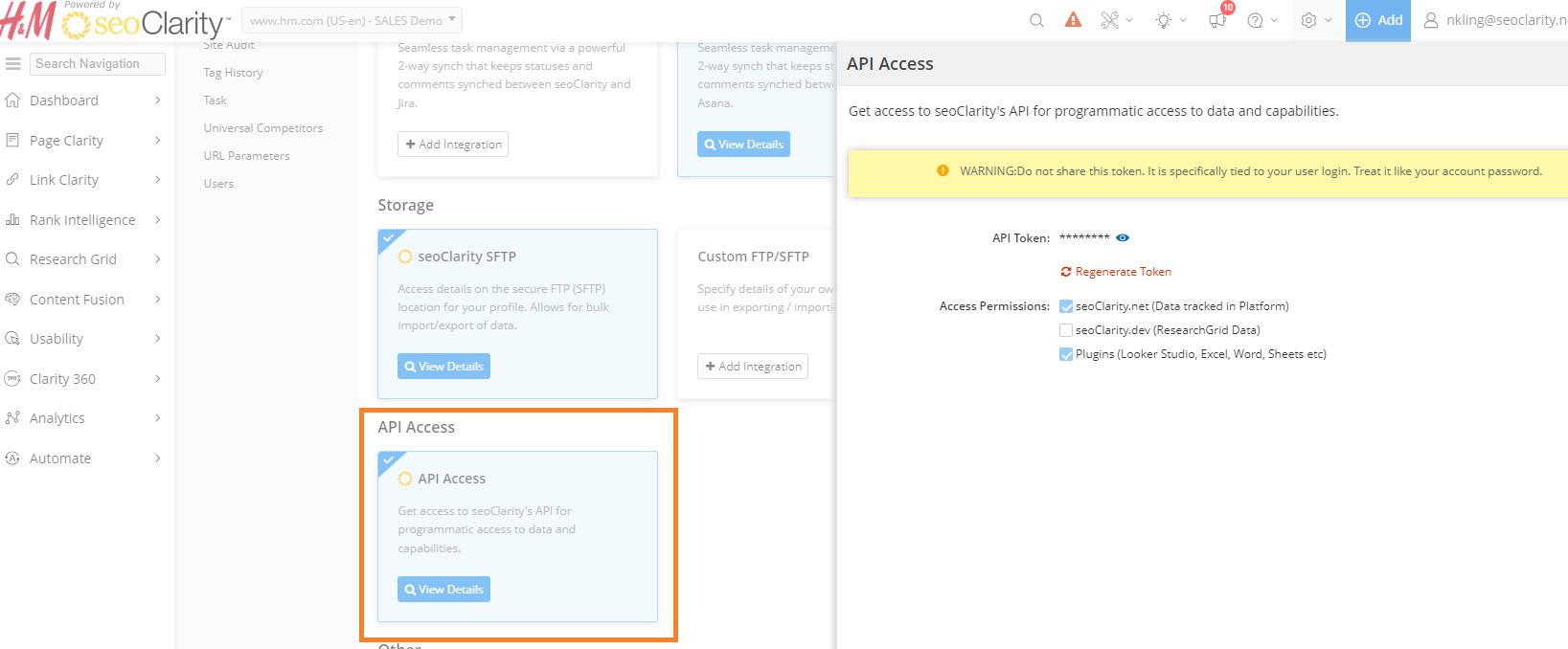 API Access: Get access to seoClarity's API for programmatic access to data and capabilities using your user and domain specific API Token.
