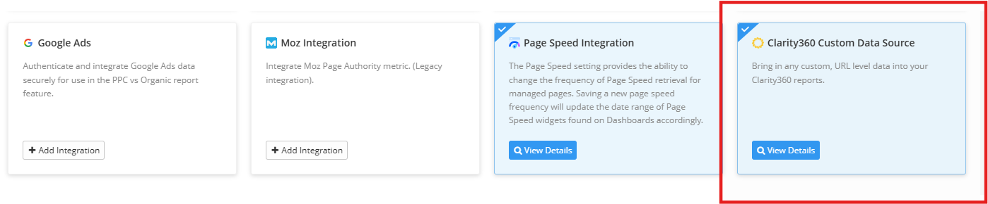 Select an integration card to view information for that integration. Integrations cards highlighted in blue denote existing integrations that have been setup, where non-highlighted cards denote integrations that are not currently setup.