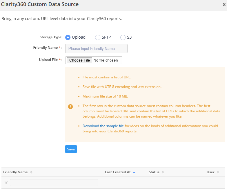Clarity360 Custom Data Source: Custom Data Source is a way to bring in URL level custom metrics. This feature adds columns for custom values Search Analytics.