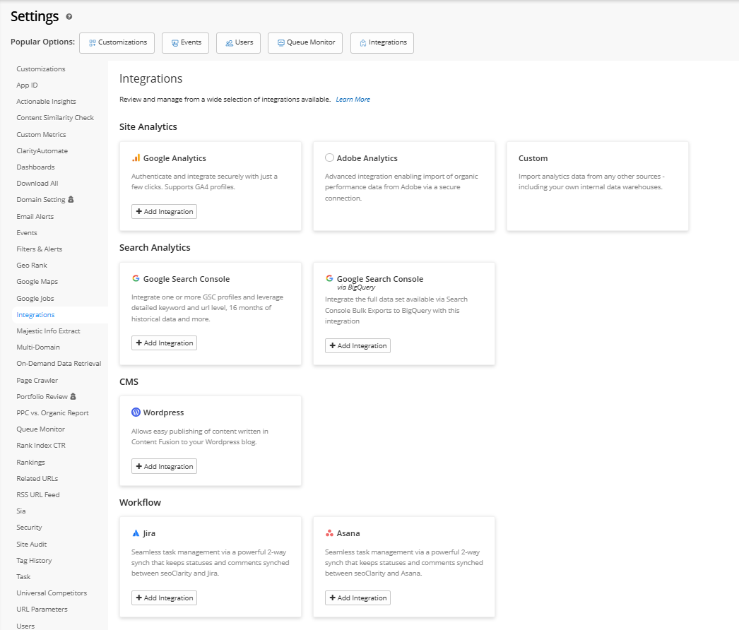 Asana: Access to Asana and Admin access to seoClarity is required for integration Learn More