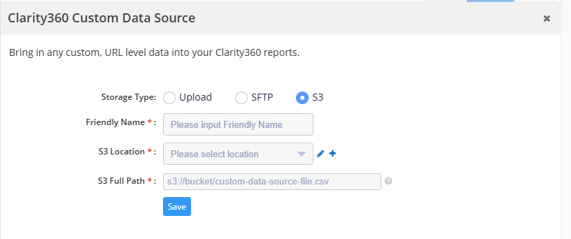 - Storage Type: Choose whether to attach a file, or source from an S3 Bucket or SFTP Location.