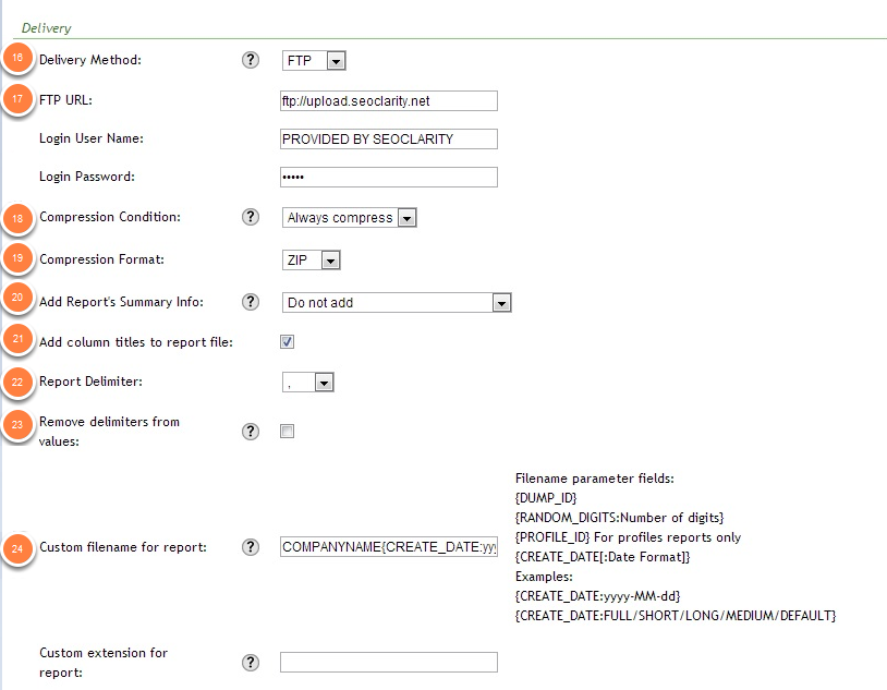 24. Custom filename for report: "<Your Domain>{CREATE_DATE:yyyy-MM-dd}". Replace <Your Domain> with the domain being integrated.