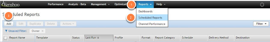 3. On the Scheduled Reports page, click on the Add button, above the data table