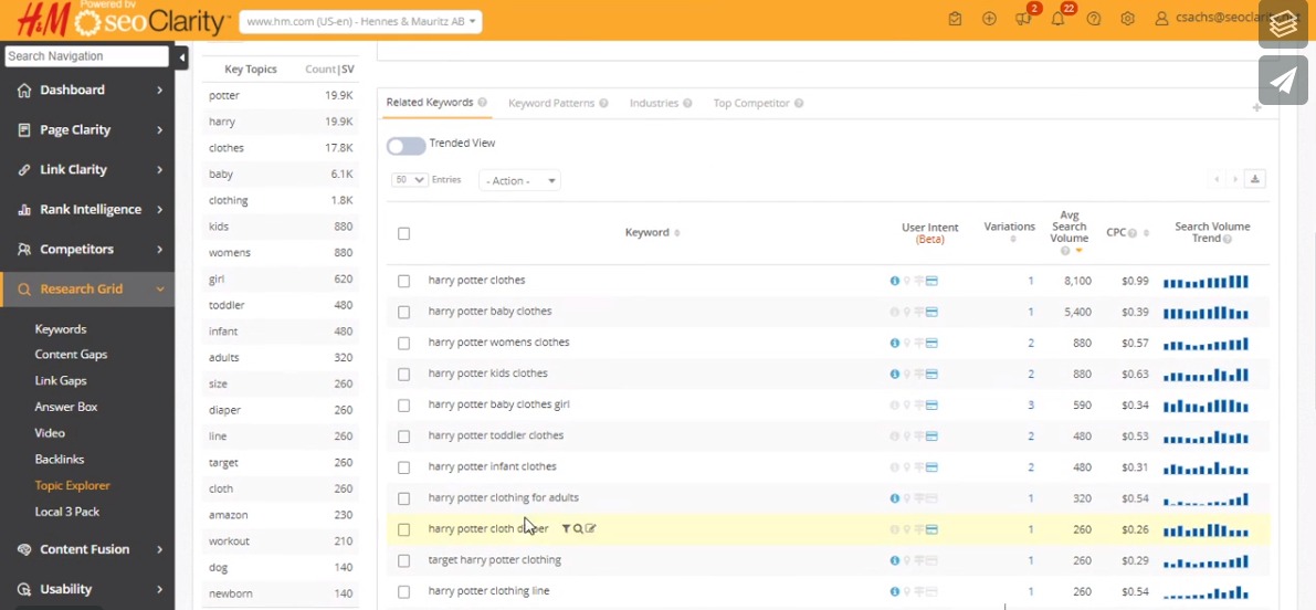1. In Topic Explorer, enter a general topic relevant to your new offering. In this example, we're imagining that H&M is launching a new Harry Potter clothing line for back to school, so we enter "harry potter clothing." For now, we'll stick with Phrase Match, and click the Search button to begin our research.
