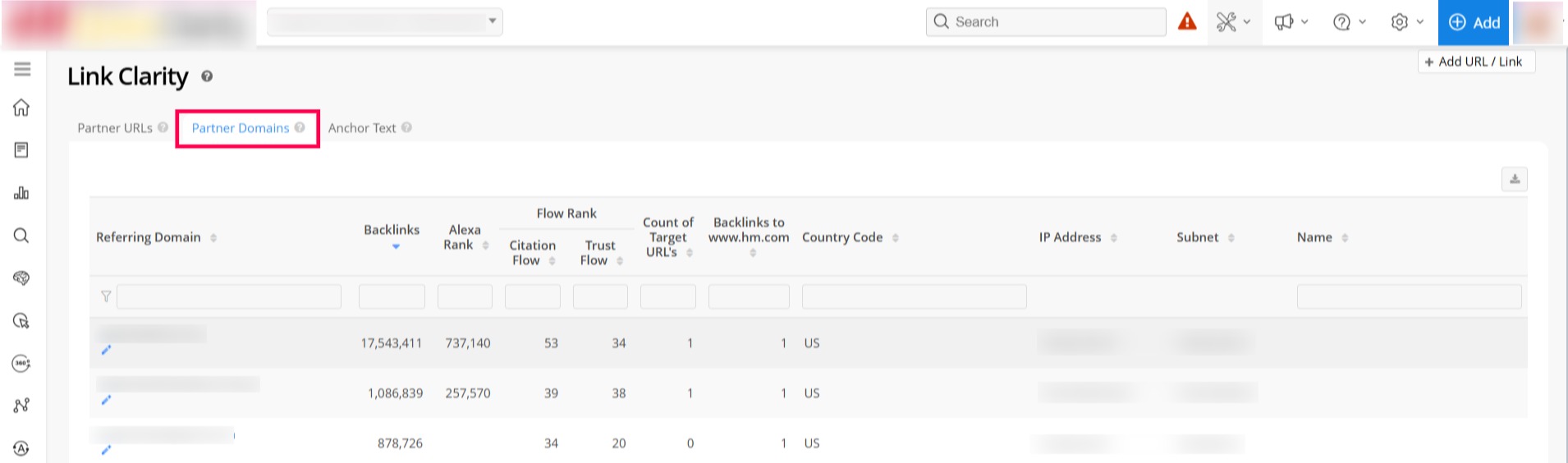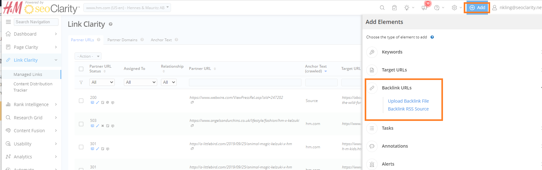 Link Clarity Managed Links is where all of your Partner URLs (backlinks) are housed and tracked. Partner URLs are backlinks that have been manually added to the seoClarity platform by you or your team. Having these Partner URLs in your account will help you track, monitor, manage, and optimize your links.
