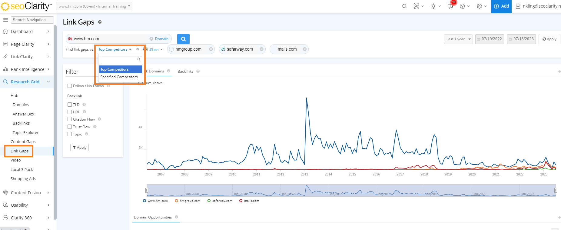Link Gaps provides a way to compare backlink profiles, based on Majestic's link index, and find backlink opportunities across multiple domains.