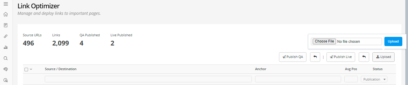 Select the Upload button to select a file with URLs to be added to Link Optimizer.