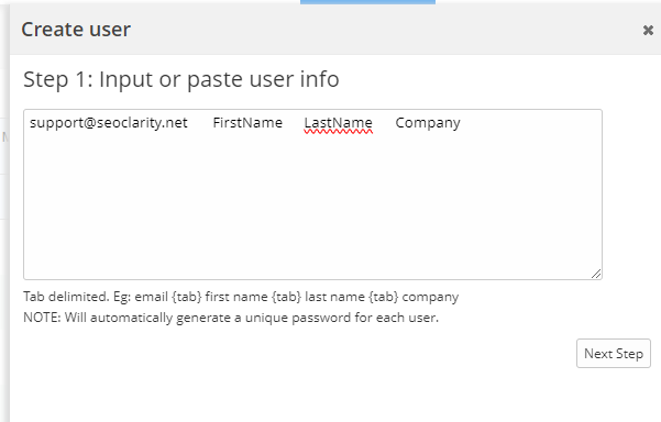 Add User: Users with admin level permissions can add or edit users access in bulk by using this option. Once selected, a dialog box will open. Enter the email address, first name, last name, and the company name with a tab in between each one. More than one user can be added a once. Click on the Next Step button to check the user information that was entered before submitting.