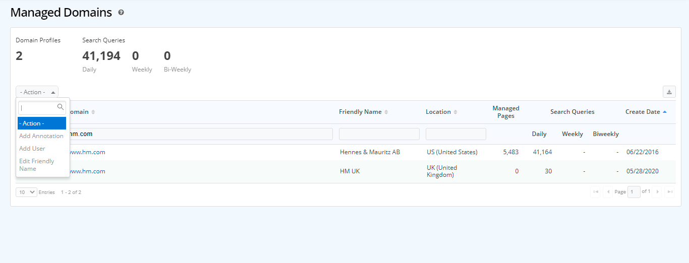Managed Domains provides a high level view of what domain is managed in the platform, what location rankings are based in, and what keyword and page elements are being managed within that profile.