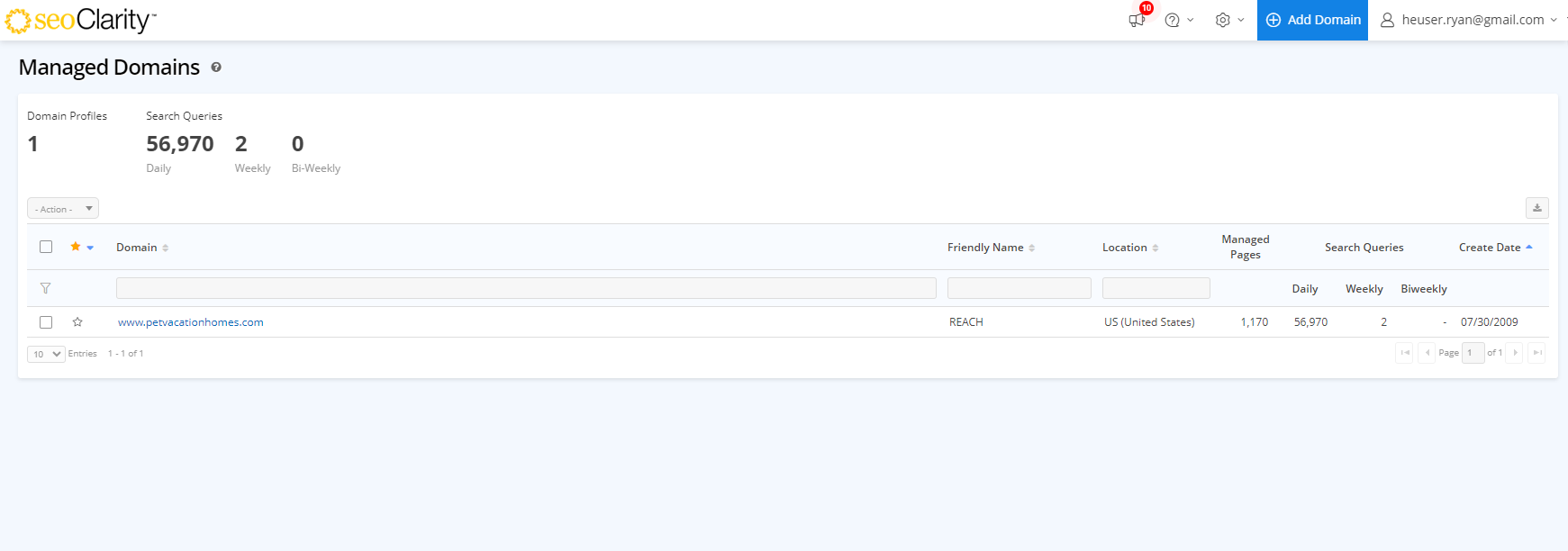 Managed Domains is where you can see all domains for which your login credentials have access to. Selecting a domain from this list will navigate to that profile within seoClarity. Domains can be added by request to support@seoclarity.net by using the domain provisioning sheet. The ability to provision a domain via the Add Domain button is available for enablement by request. Learn More