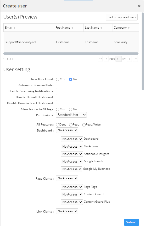 Review the user information that has been entered. Select the permissions to add to all the users that have been entered in the preview. This list of users and permissions will be added to all the domains that were selected in the previous step. Click on Submit to add the user(s).