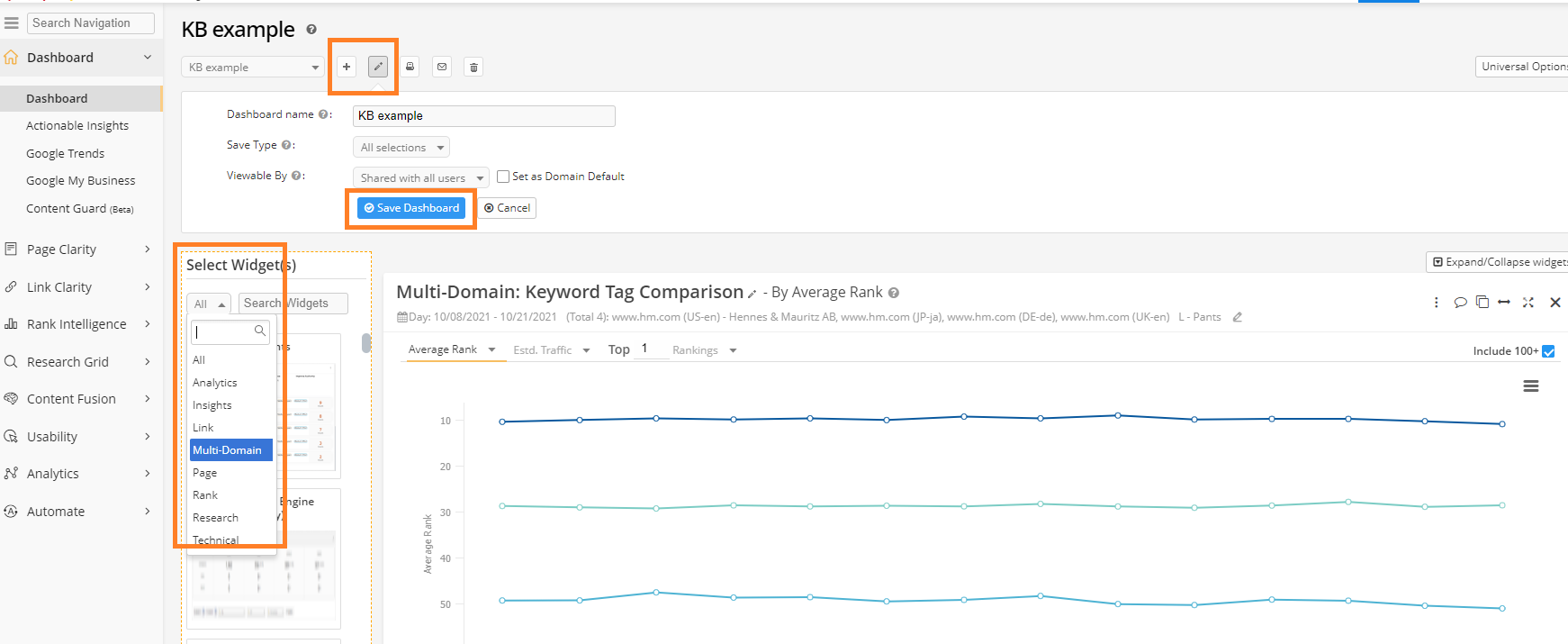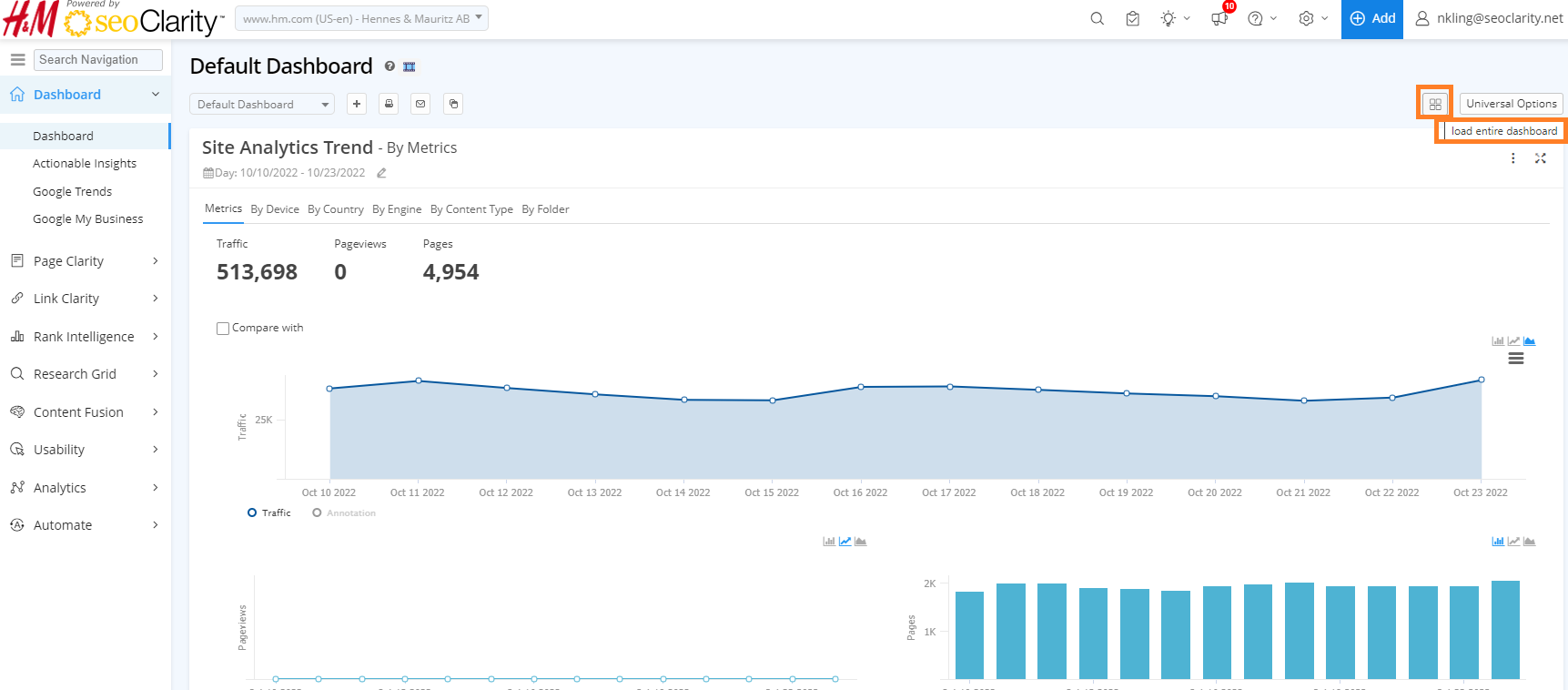In order to use the Multi-Domains feature you must have multiple domain profiles provisioned within seoClarity. The feature can be enabled via the Multi-Domain settings (contact support@seoclarity.net) if you want this function enabled). Dashboards with many widgets will take longer loading. The default method for loading all the widgets in a dashboard is by using lazy loading where the user scrolls to the bottom of the page to continue loading more widgets. The icon using four small boxes on the top right corner allows for loading the dashboard in its entirety without scrolling to the bottom of the page continuously.