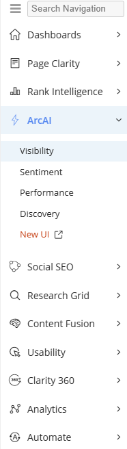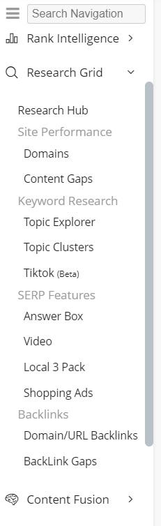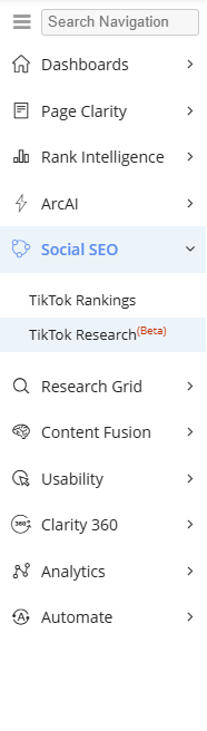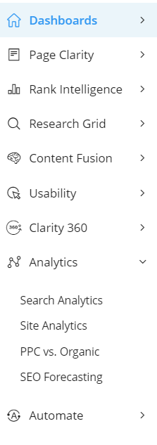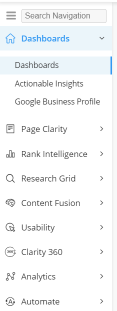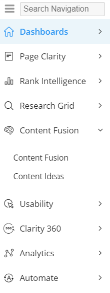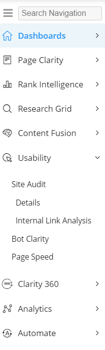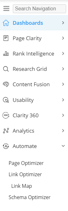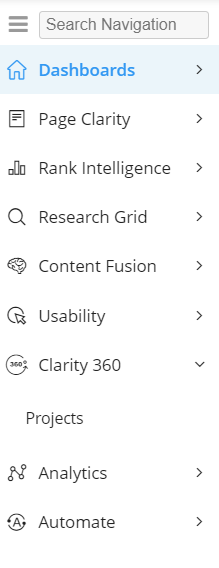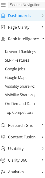 The navigation menu is highlighted by sets the foundation for new features in the future. In order to make the seoClarity platform easier to navigate, the menu is searchable. Enter in the name of a feature in the platform into the search bar to find the location of it in the menu.