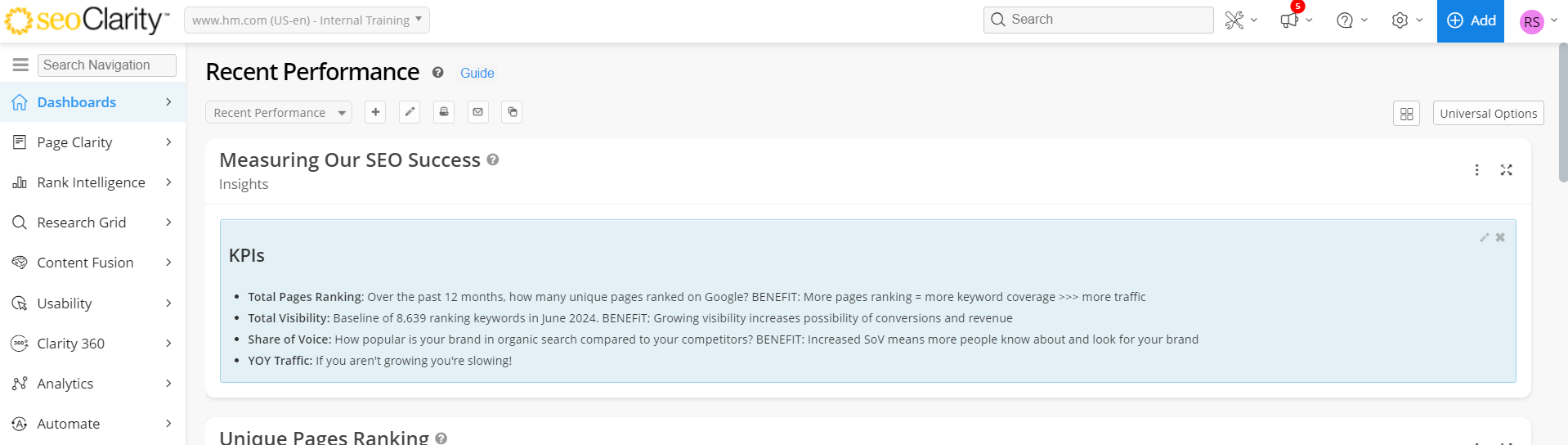 Dashboards will be the first page you see when you enter your seoClarity account. These dashboards offer a high level overview of your account.