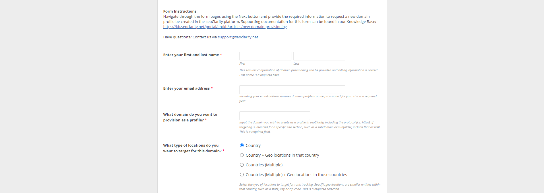 Overview To have a new domain profile provisioned within the seoClarity platform, the attached form needs to be filled out. Once filled out, the form will automatically create a Support Ticket and put you in touch with our Support team. Notice: ...